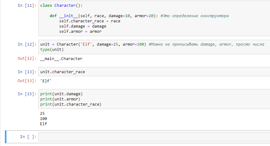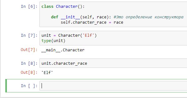 __init__ это специальное имя метода, записанное специальным образом, со специальным синтаксисом с двумя подчеркиваниями слева и справа, чтобы отличать специализированные методы от всех остальных. Метод имеет аргументы, первым аргументом указывается self, это ссылка на экземпляр, все атрибуты присущие объекту мы записываем через ссылку self. Вторым аргументом мы принимаем расу, а строкой ниже мы атрибуту на уровне объекта класса присваиваем значение из аргумента race. Теперь мы должны передать в переменную unit нашу расу. Мы можем вызвать атрибут character_race, который мы создали, и в этот character_race было записано то, что мы передали в качестве аргумента в конструктор, то есть "Elf".