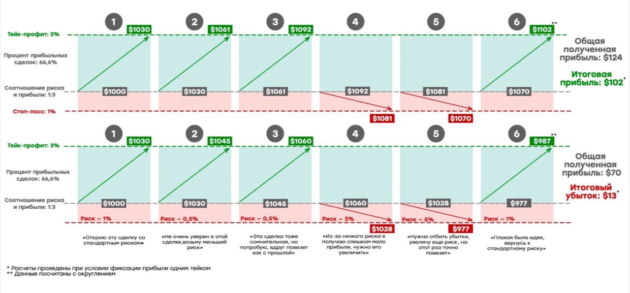 Если бы в обеих случаях риск был одинаковым, например, 0,5%, то по итогу этих двух сделок результат был бы +1%. Вы должны знать, чем рискуете и ради чего.