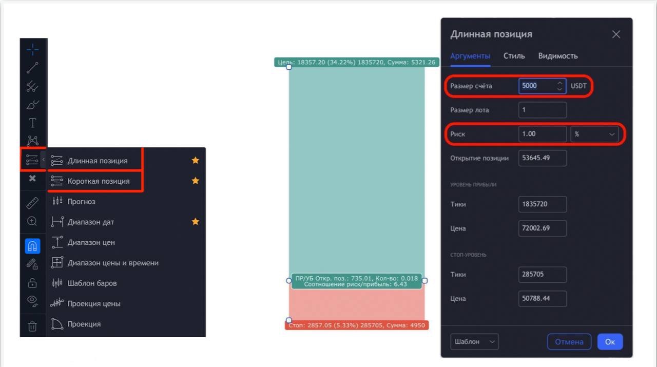 Используйте встроенный в TradingView калькулятор и считайте, на какой объем нужно войти в сделку, чтобы в случае стоп-лосса был фиксированный убыток.