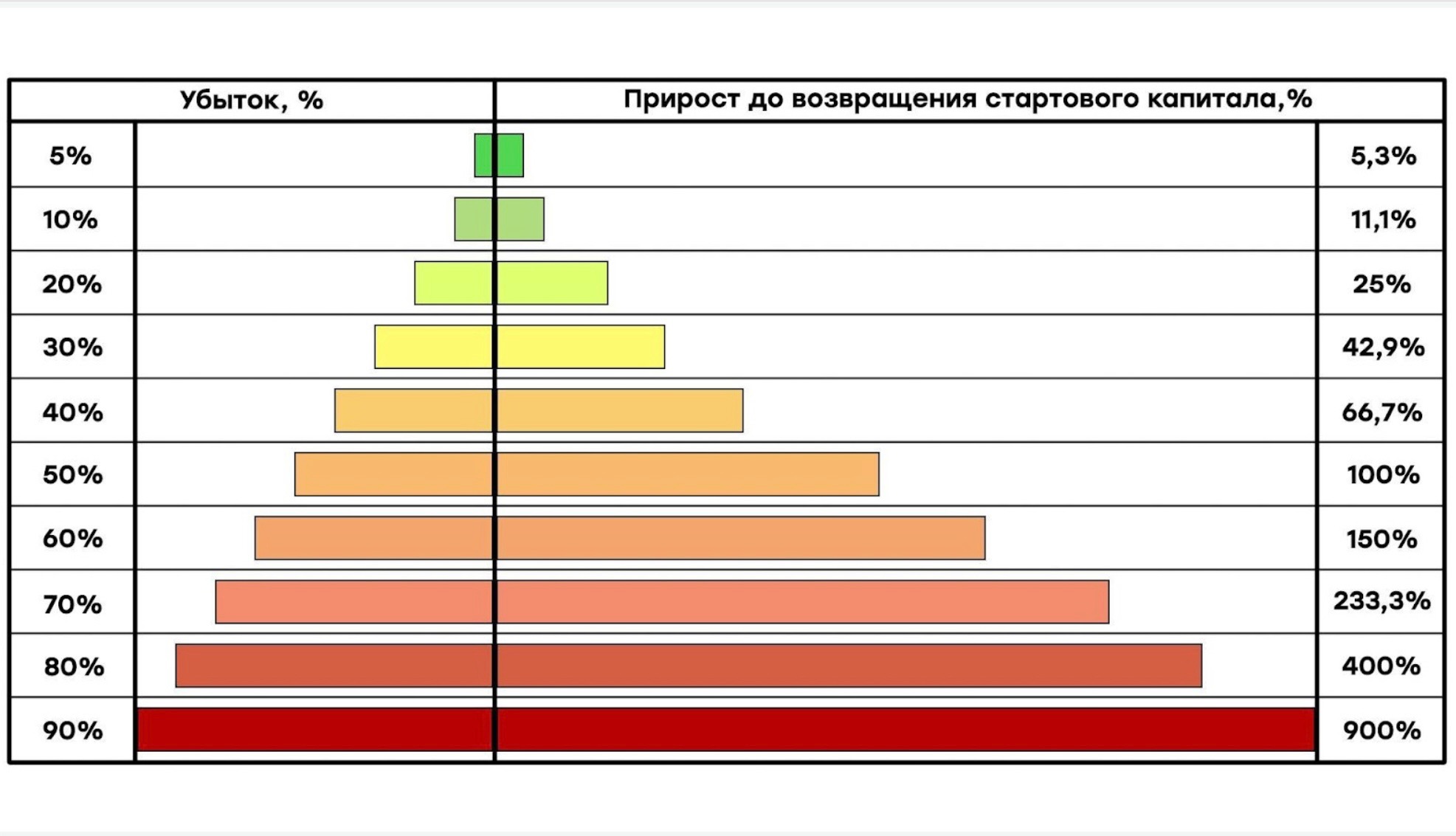 Даже если вы потеряете всего часть депозита, к примеру, половину, вам потребуются огромные усилия для возврата к первоначальным значениям, потому что вы должны будете заработать 100% от депозита, который у вас останется к тому моменту