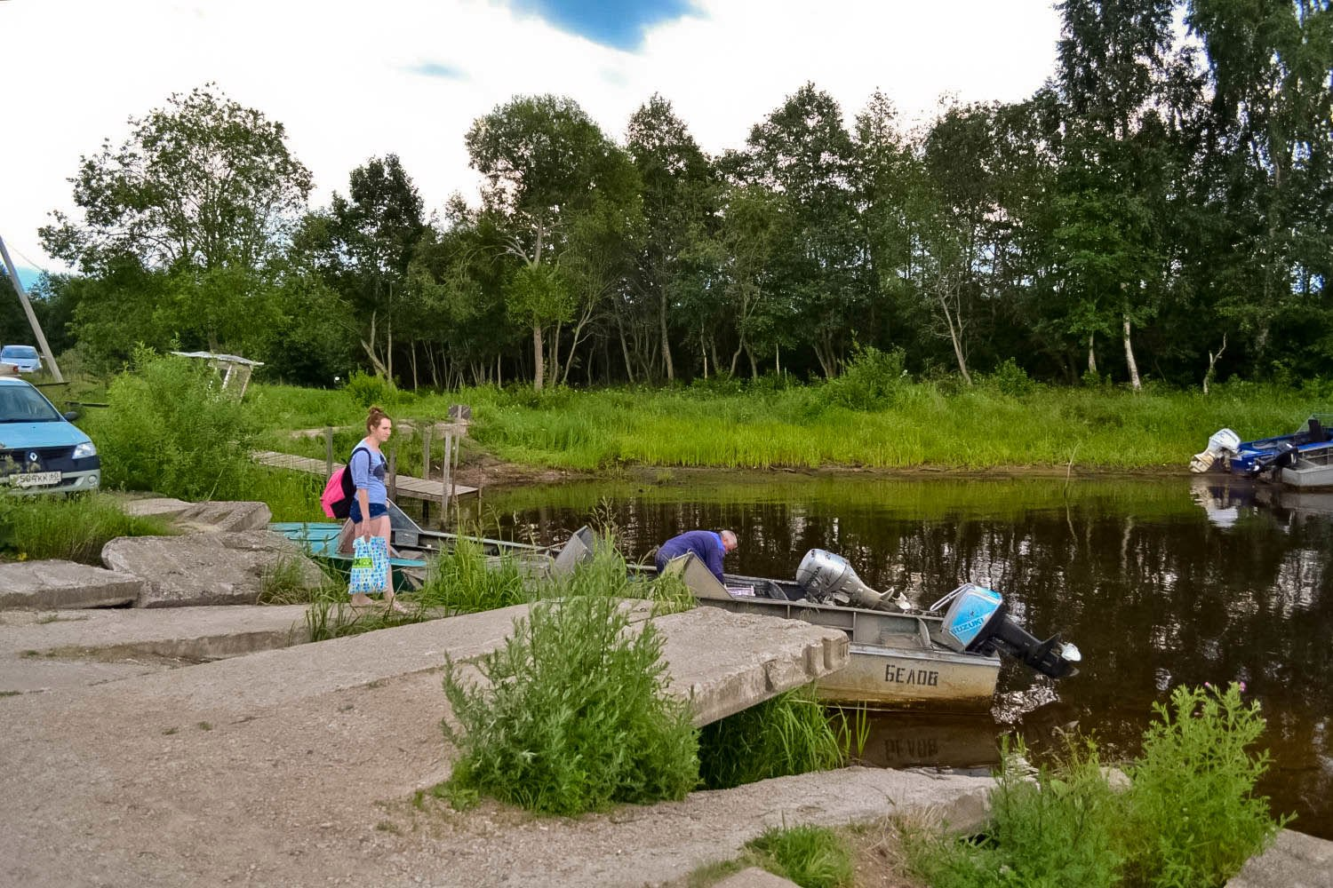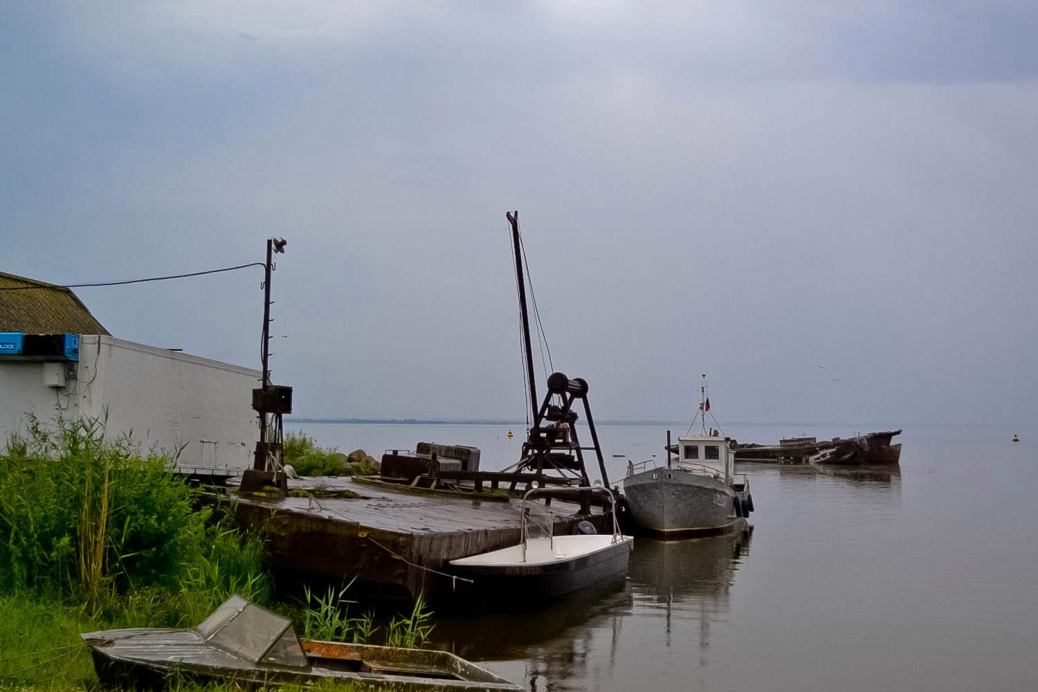 Прежде всего на острова надо попасть, и это наш первый квест. Вам очень повезло, если в конкретное место ходит рейсовый катер. Ещё больше если он отправляется несколько раз в день. Совсем уж фантастика - судно, моложе 1960 года. В противном случае ищи местных в камуфляже, с прищуром, сквозь плохие зубы заламывающие какие-то дикие цифры. О дороге обратно по этим же причинам лучше обеспокоиться заранее. Остров начинается с причальной жизни - парковка автомобилей тамошних на большой земле, самодельные пирсы из бочек и настилов, бесконечные контейнеры, бытовки, сушащиеся сети, остатки бетона старого причала на фоне угрюмых лодочных гаражей и пробивающийся сквозь всё это дело тростник.