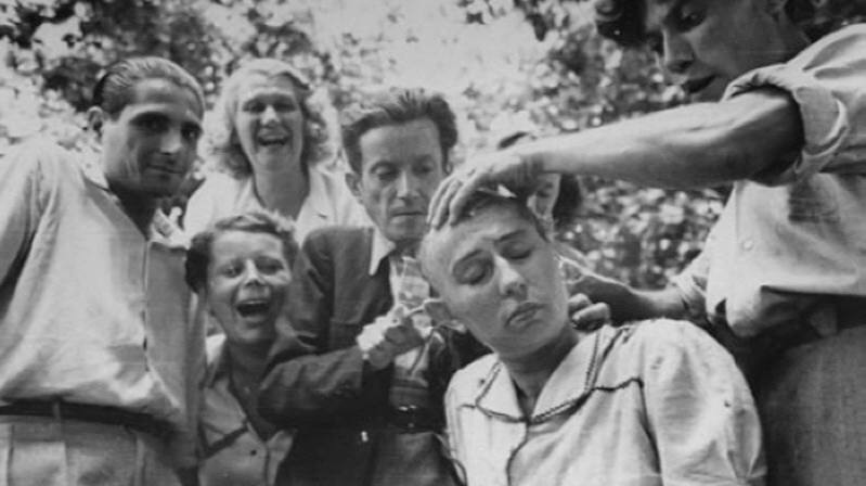 Очевидец тех событий: ”Мимо нас, под аккомпанемент ругани и угроз, медленно ехал открытый грузовик. В кузове было около дюжины женщин, все — с обритыми наголо головами, низко опущенными от стыда”.
