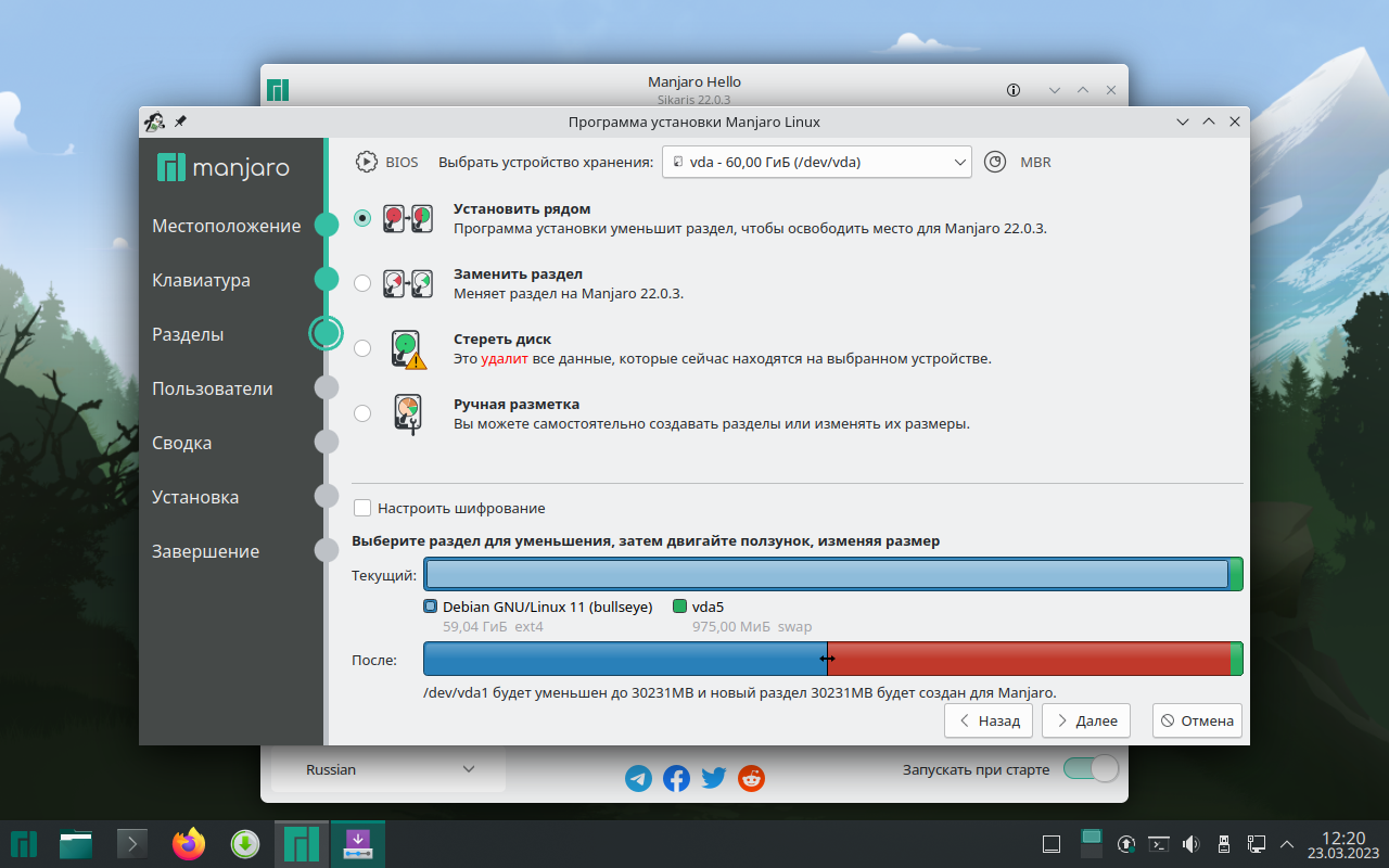 И если ты не хочешь (а ты скорее всего не хочешь) потерять свою Windows, то просто бери опцию установить рядом. Тыкай на полоску (раздел) и двигай ползунок чтобы выбрать размер новой системки, по умолчанию она занимает 50% от диска