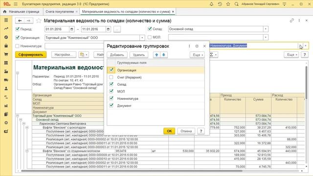 Отчет материальная ведомость
