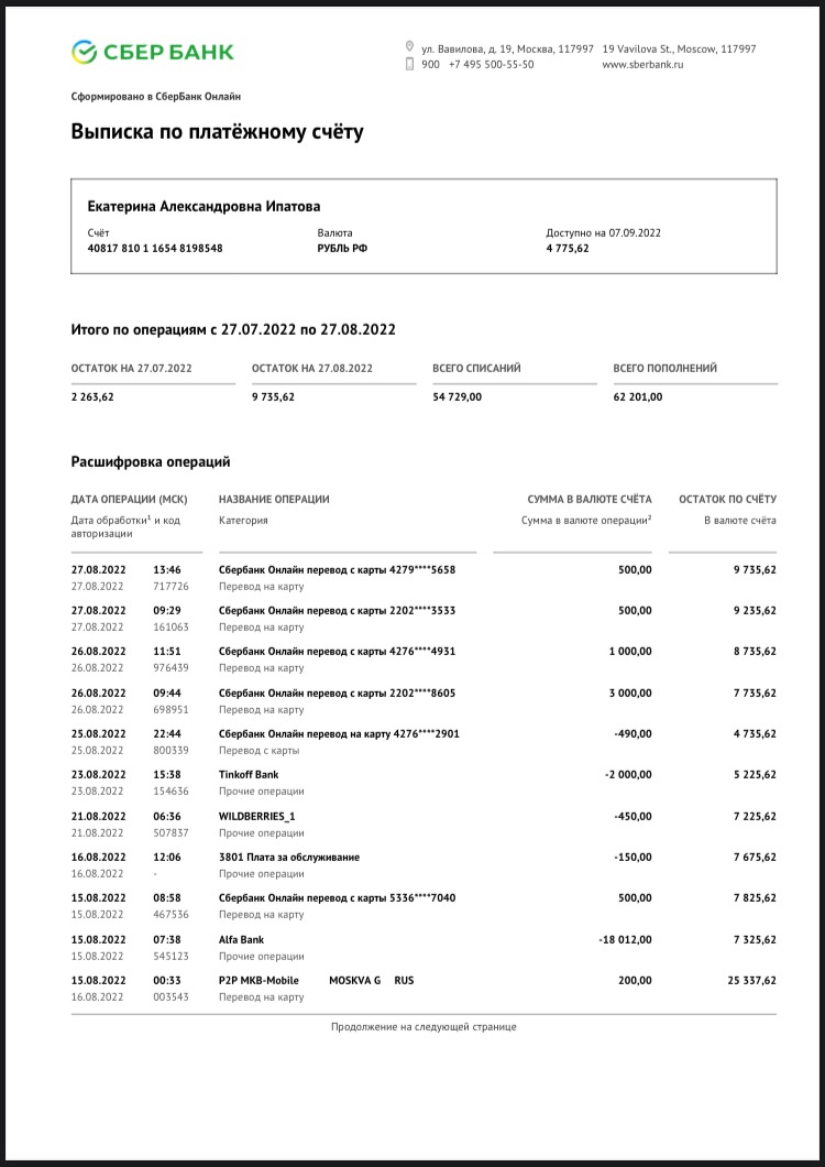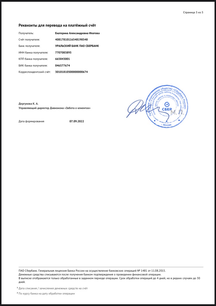 Екатерина Ипатовас 27.07.2022 по 27.08.2022
