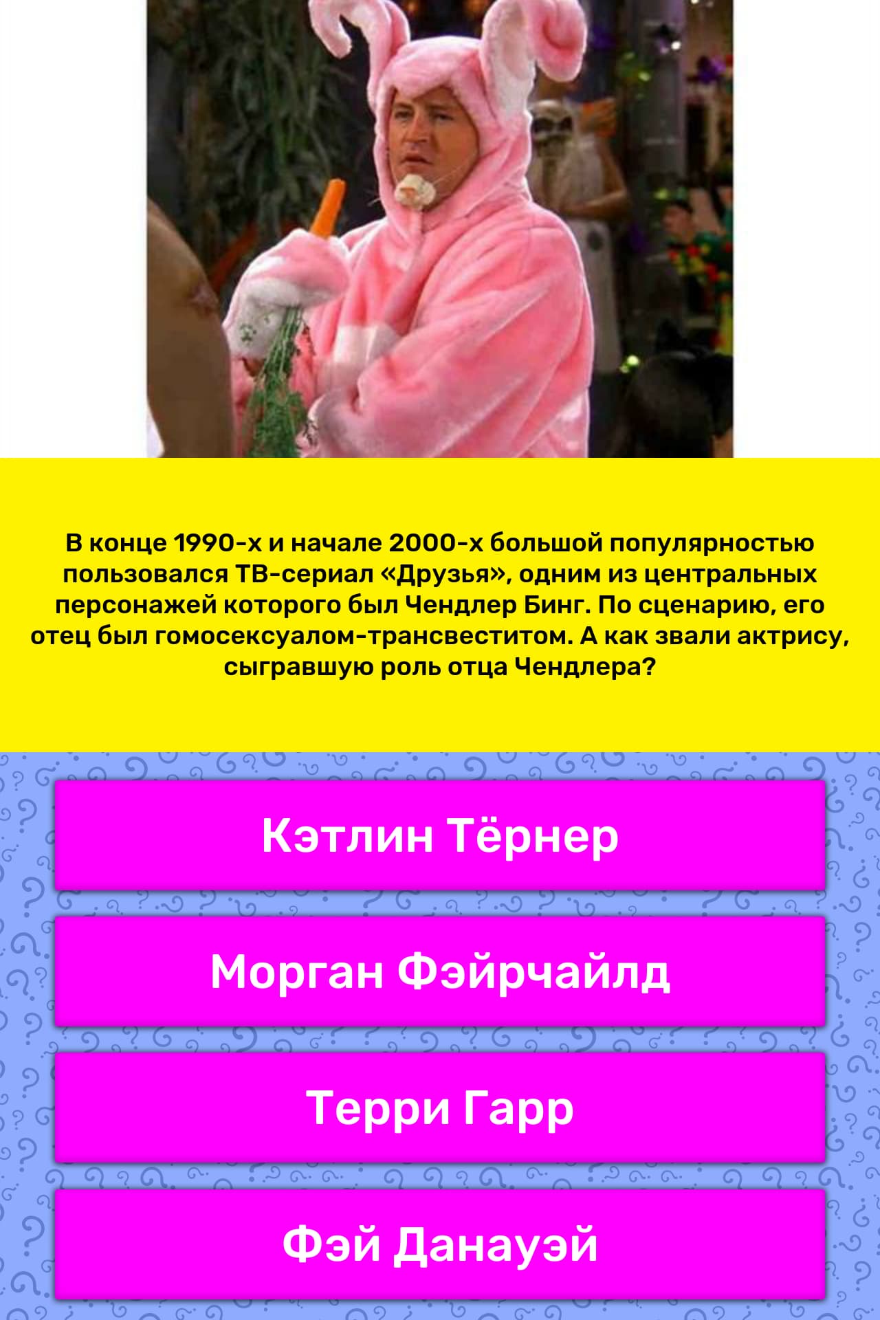 Актриса Кэтлин Тернер снялась в массе фильмов, получила две премии «Золотой глобус» и номинацию на «Оскар» . Но большинство зрителей все равно помнят ее как папу Чендлера — Чарльза Бинга, также известного как звезда . . .
