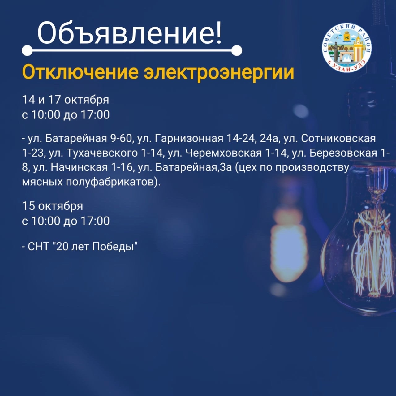 Отключения электроэнергии в советском районе челябинска