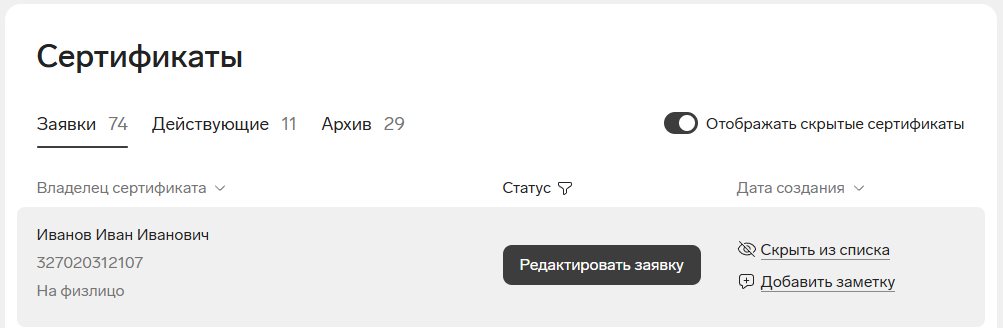 Открыть список сертификатов