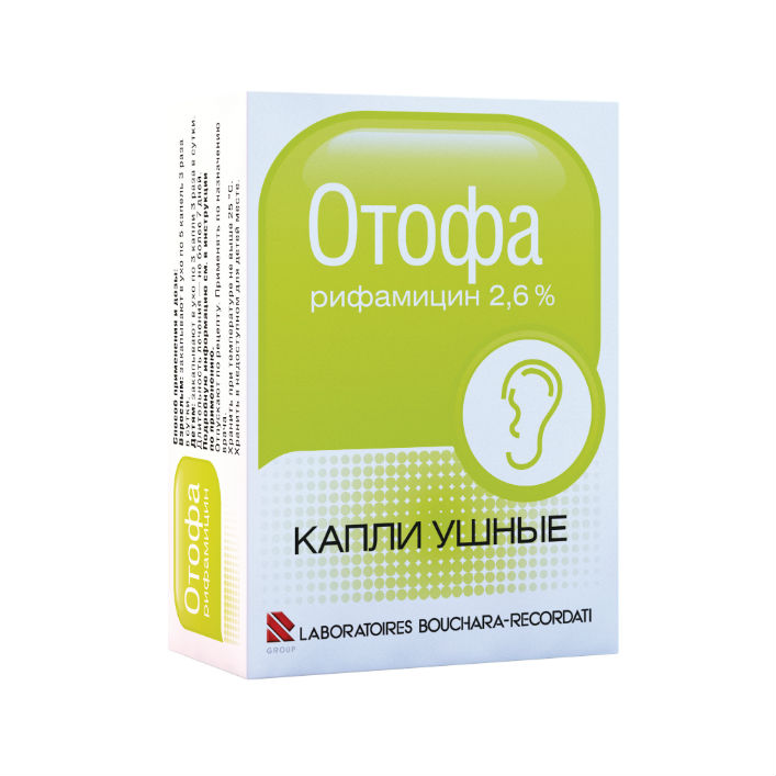 Отофа . Отофа - ушные капли, содержащие только 1 компонент . Это антибиотик из группы рифампицинов - рифамицин натрия .