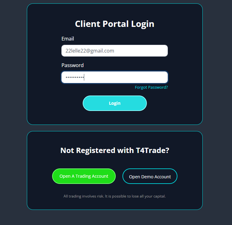 Заходим на сайт - t4trade.com и нажимаем в верху справа кнопку "Login".