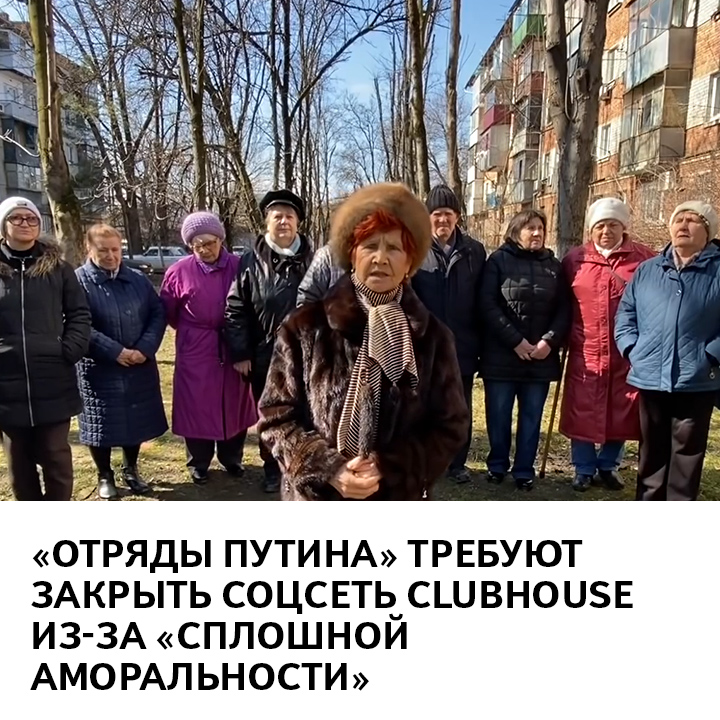 Отряд "бабушек Путина" потребовал закрыть Clubhouse . Пенсионерки из движения "Отряды Путина" требуют закрыть социальную сеть Clubhouse .Они уверены, что она портит молодежь и пропагандирует наркотики .