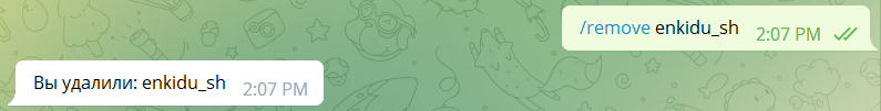 Для того чтобы удалить нового пользователя нужно ввести команду /remove никнейм пользователя без @