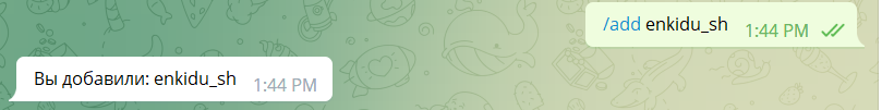 Для того чтобы добавить нового пользователя нужно ввести команду /add никнейм пользователя без @