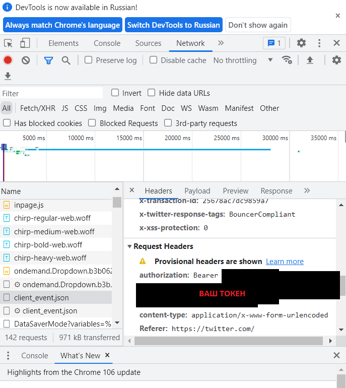 Где найти токен Twitter? Заходим в браузере в Твиттер, нажимаем CTRL + SHIFT + I , обновляем страницу и нажимаем на один из белых появившихся блочков. Затем листаем вниз до вкладки Request Headers и напротив authorization копируем значение правой кнопкой мыши copy value