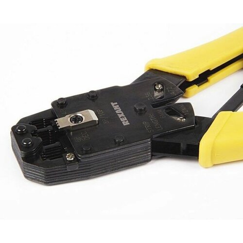 La sertisseuse REXANT HT-200R est un outil d'installation électrique universel pour sertir les connecteurs RJ-45 (8P8C et 10P10C), RJ-12 (6P6C), RJ-11 (6P4C et 6P2C) et RJ-10 (4P4C), ainsi que pour dénudage d'isolant, coupe de fils. Le corps est en acier à outils trempé à haute résistance avec une finition bleuie. Equipé de lignes de corps arrondies pour une utilisation sûre et une adhérence optimale de la surface sans écaillage ni déformation. Le mécanisme à cliquet garantit un cycle complet de sertissage de haute qualité. Le ressort de rappel assure le mouvement de retour des poignées. Les poignées avec revêtement synthétique ne glissent pas des mains pendant le processus de travail.