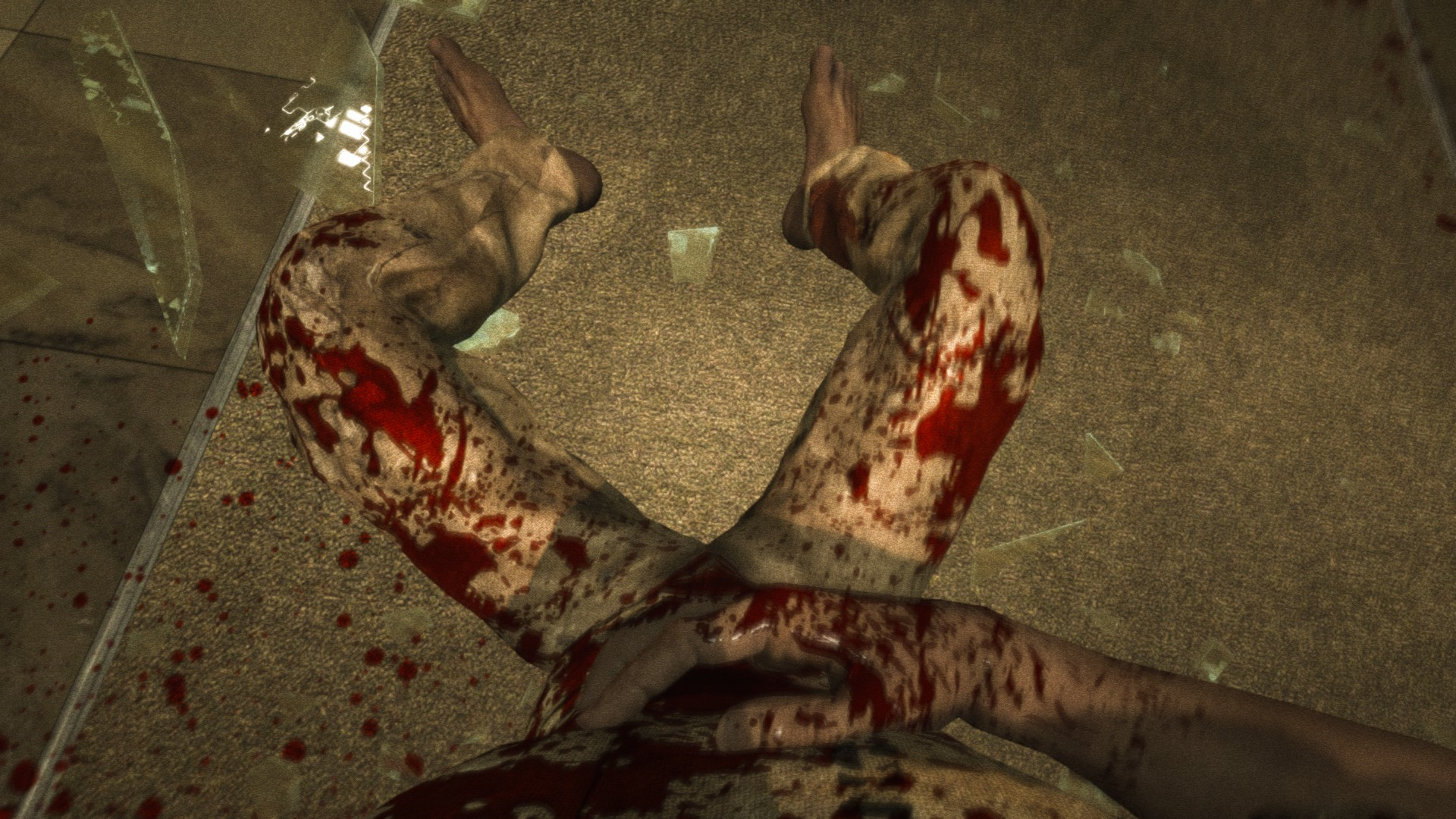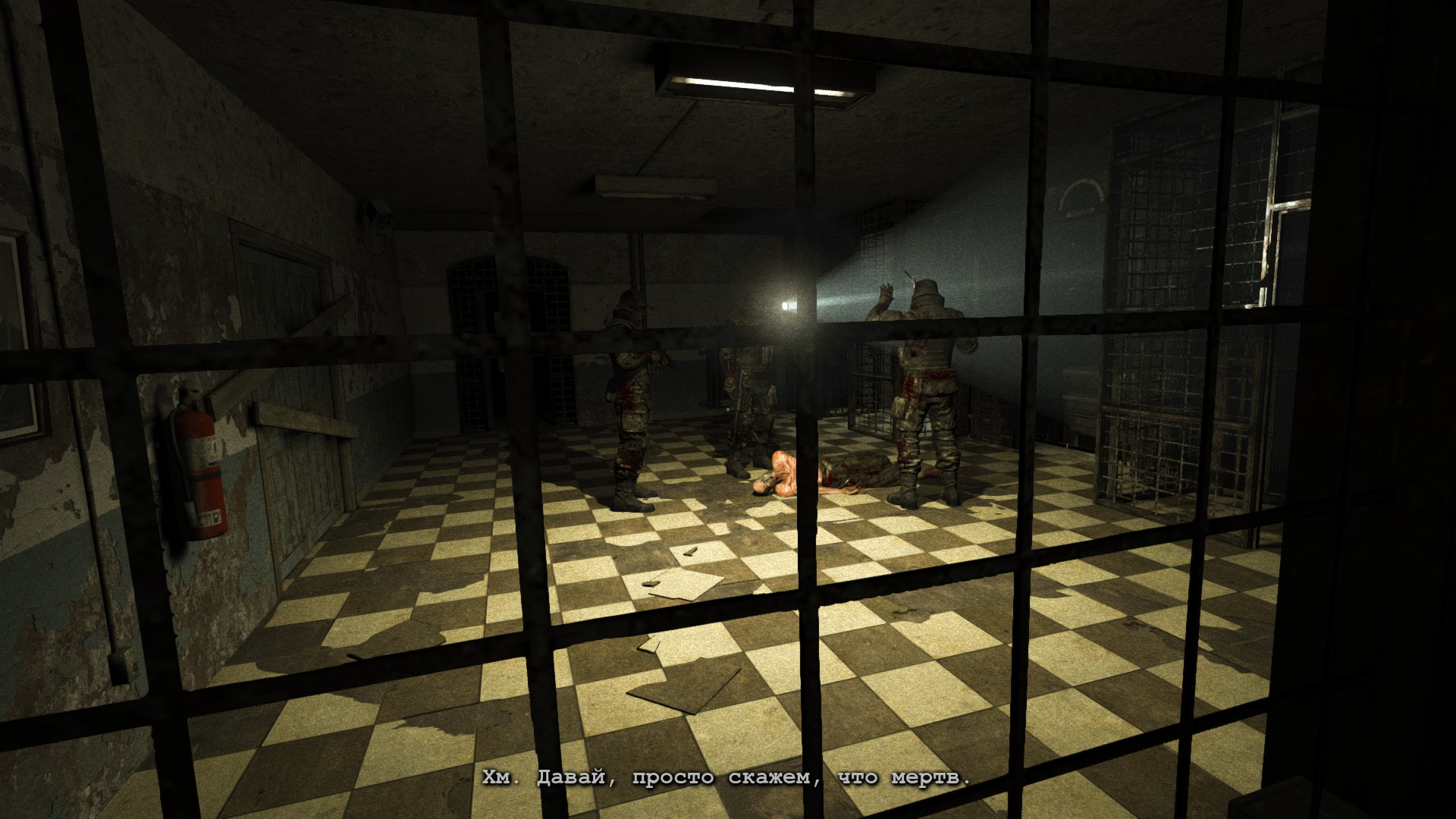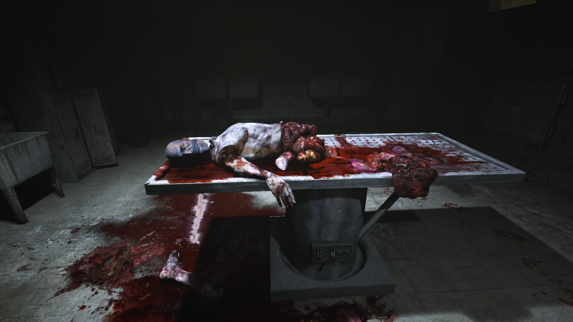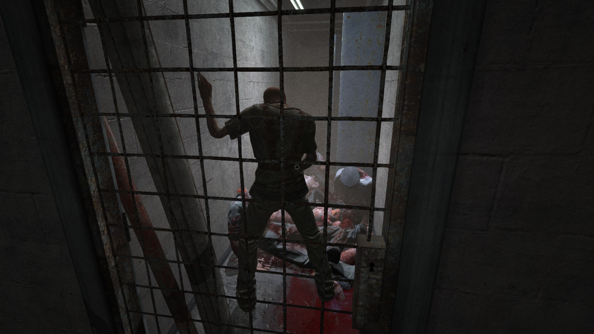 ГГ проникает в лечебницу через окно и наблюдает кровавую ванную: много трупов, крови и бегающих психов, которые могут на тебя как прыгнуть, так им вообще все равно.
