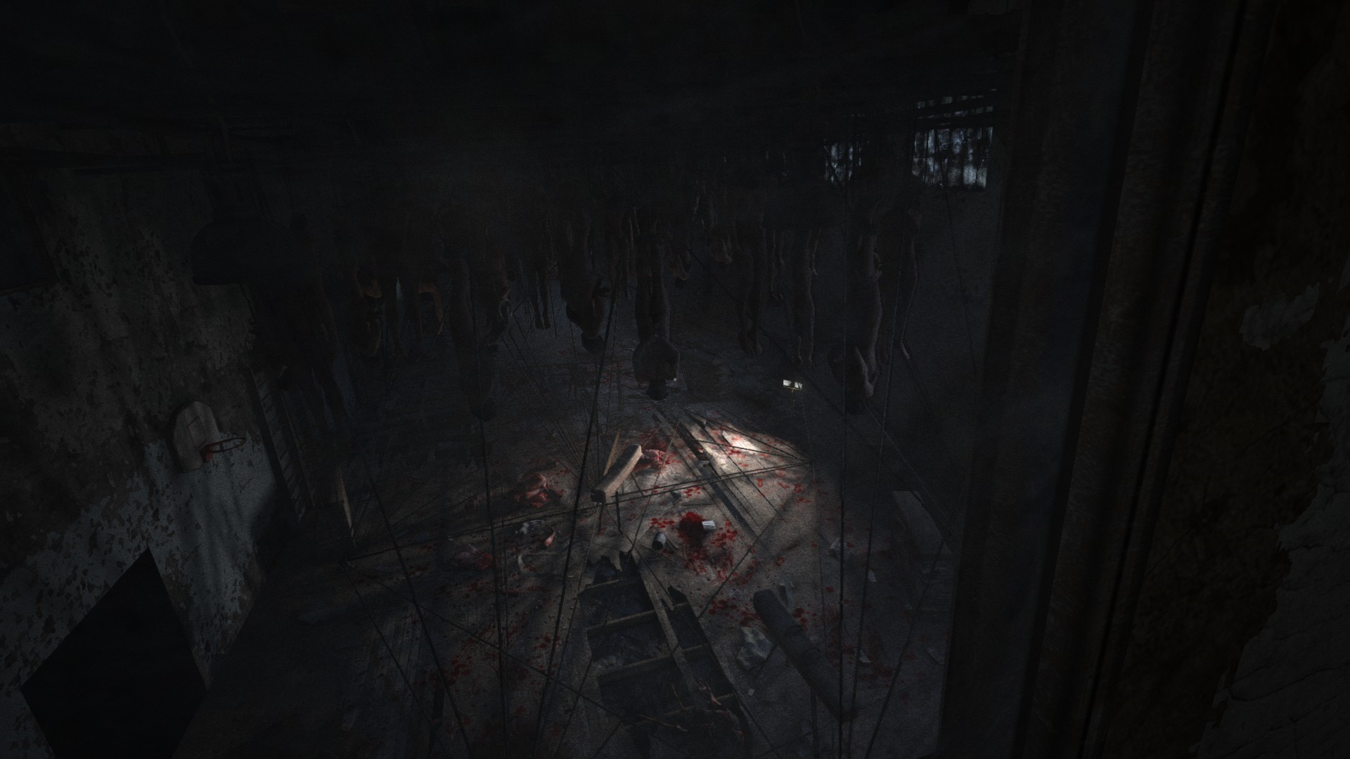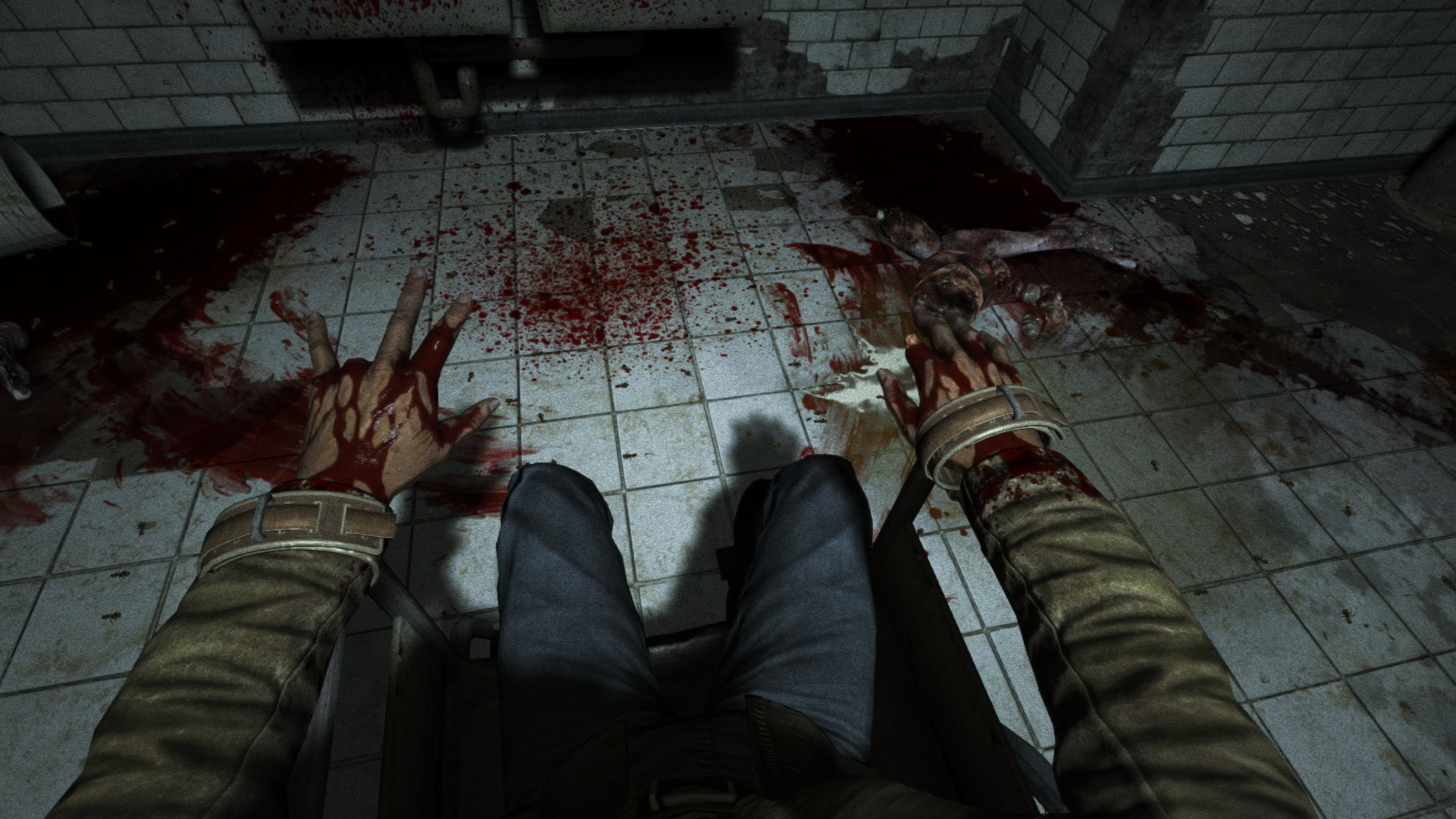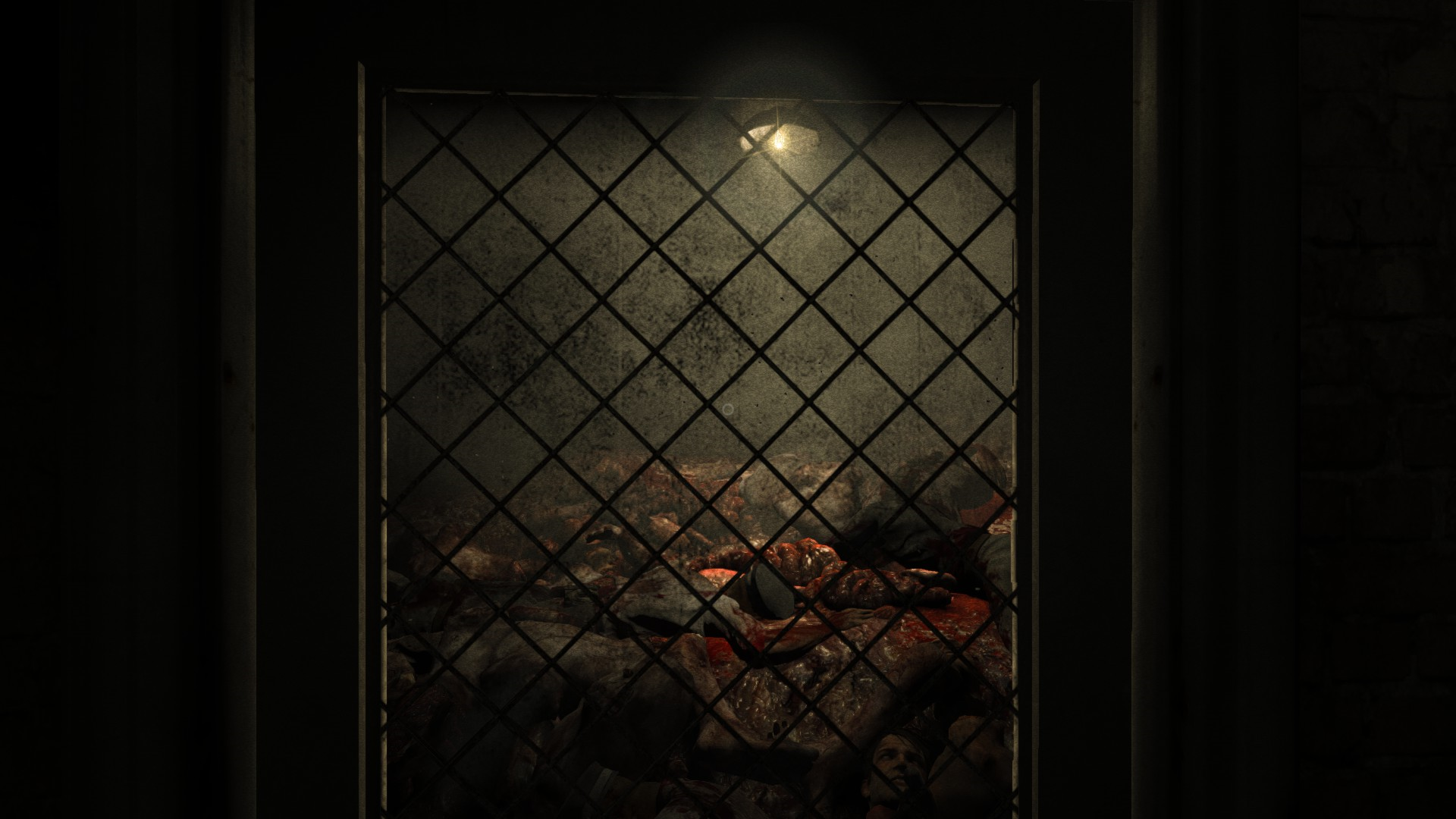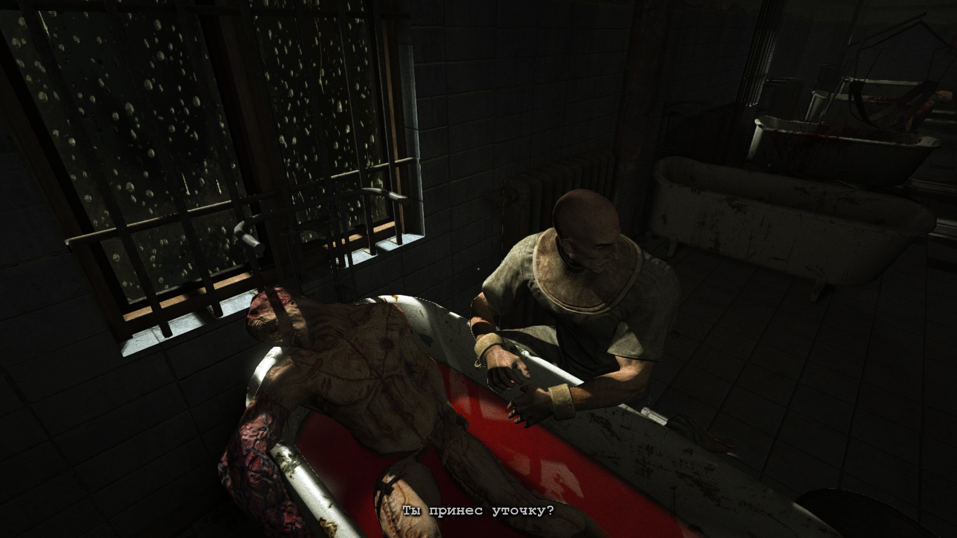 ГГ проникает в лечебницу через окно и наблюдает кровавую ванную: много трупов, крови и бегающих психов, которые могут на тебя как прыгнуть, так им вообще все равно.