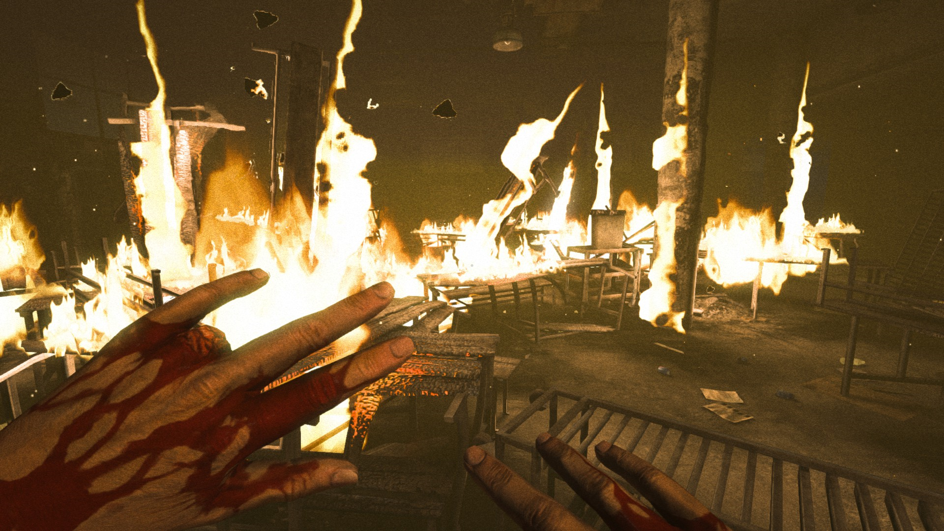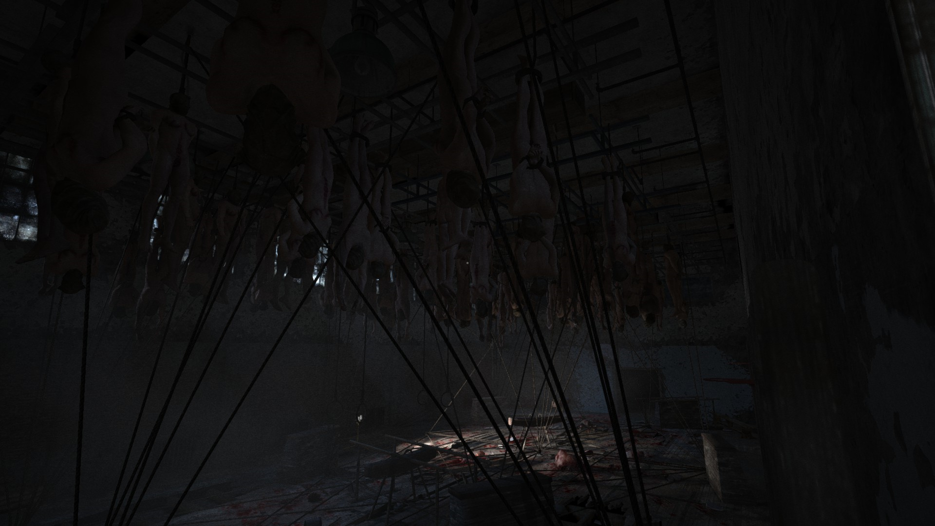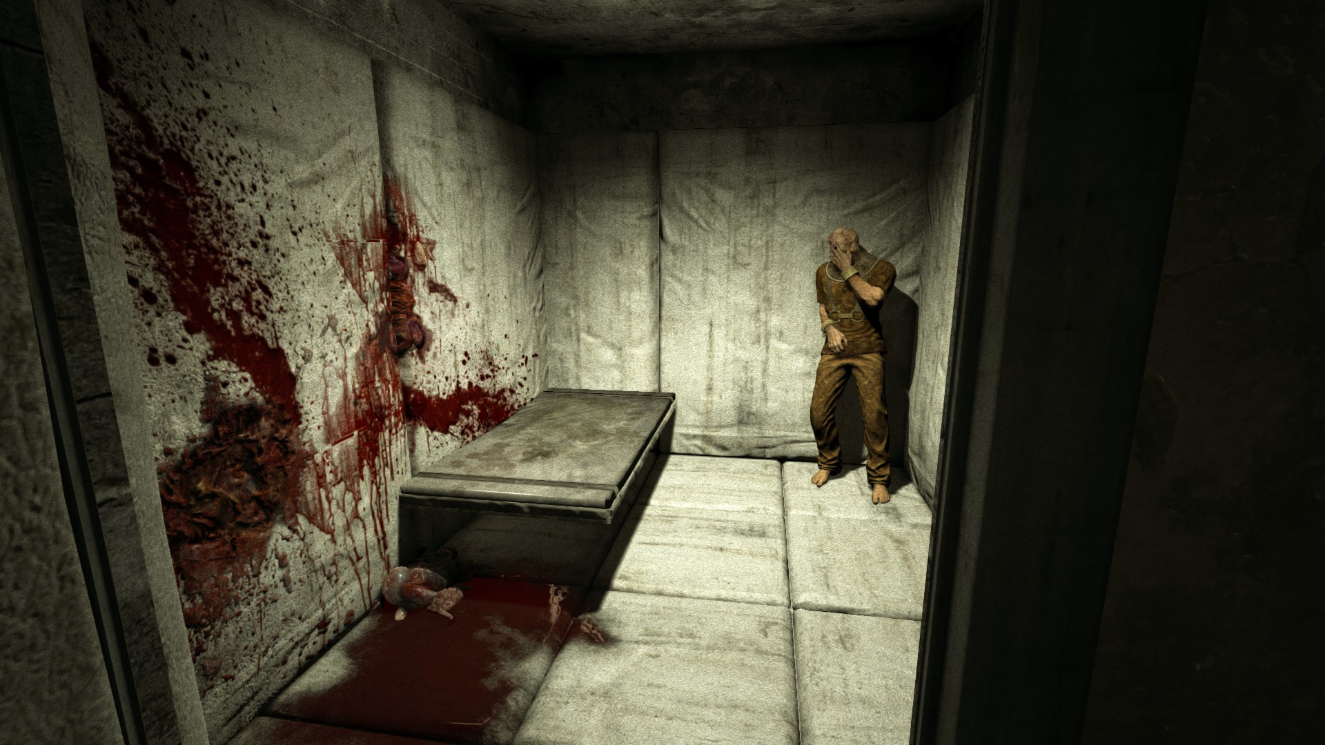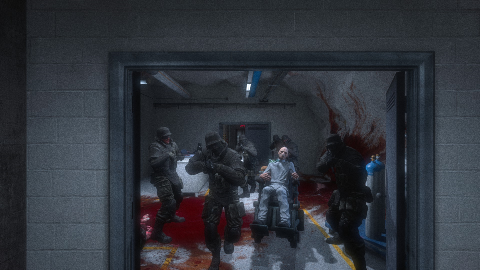 ГГ проникает в лечебницу через окно и наблюдает кровавую ванную: много трупов, крови и бегающих психов, которые могут на тебя как прыгнуть, так им вообще все равно.