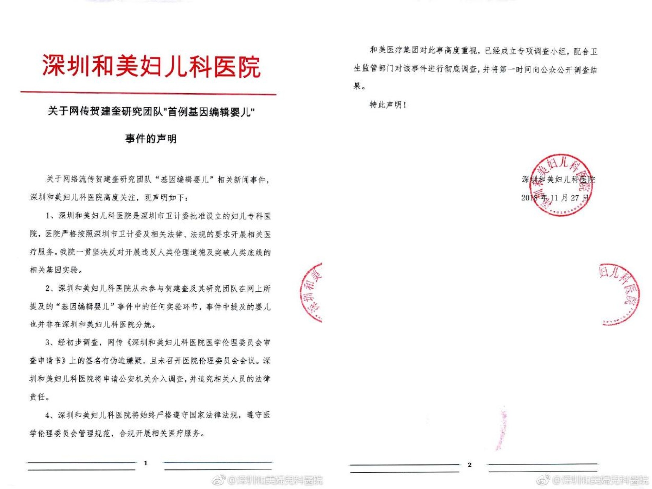 [07]深圳和美婦兒科醫院 - 关于网传贺建奎研究团队“首例基因编辑婴儿”事件的声明