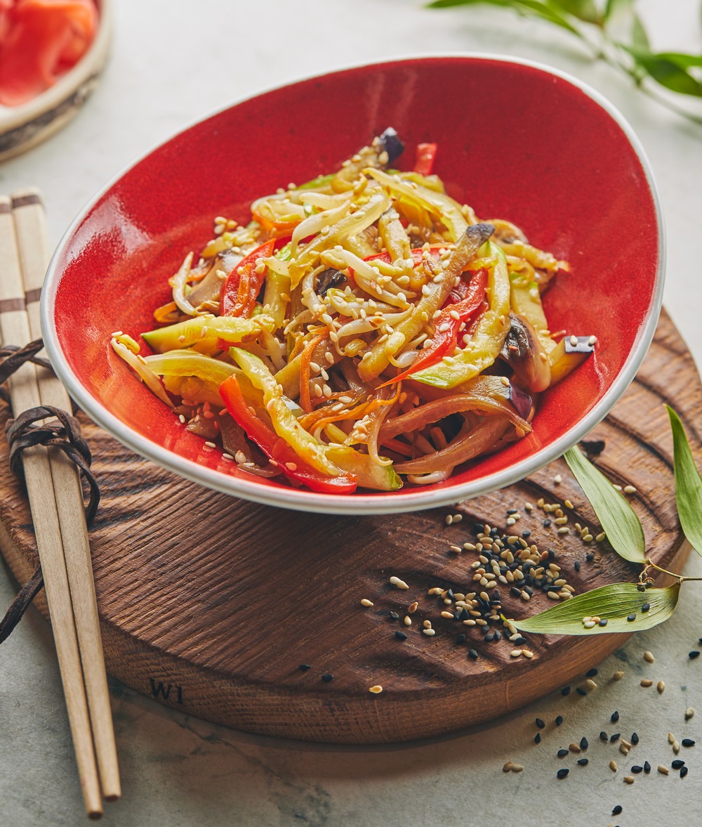 - Выложите овощи теппан на тарелку и посыпьте кунжутом.