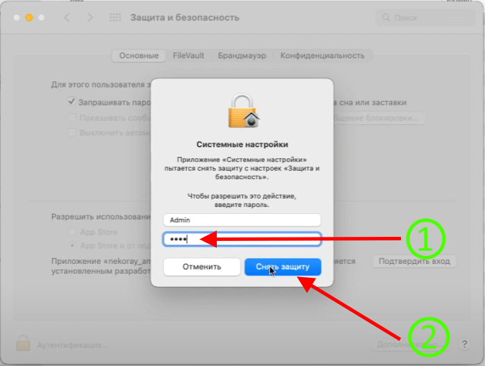 ▪️ -> вводим пароль от своей учетной записи -> жмём Снять защиту ->