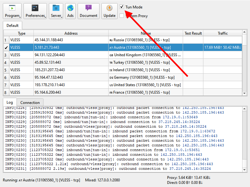 5. В верхнем меню установите галочку на режим «TUN Mode».