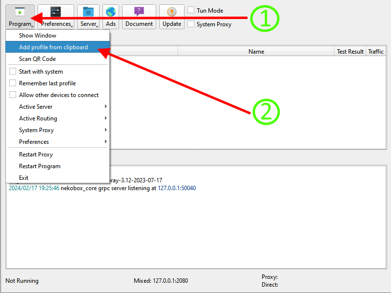 Вернитесь в программу Nekoray, нажмите на кнопку «Program» и выберите «Add profile from clipboard» и нажмите ОК.