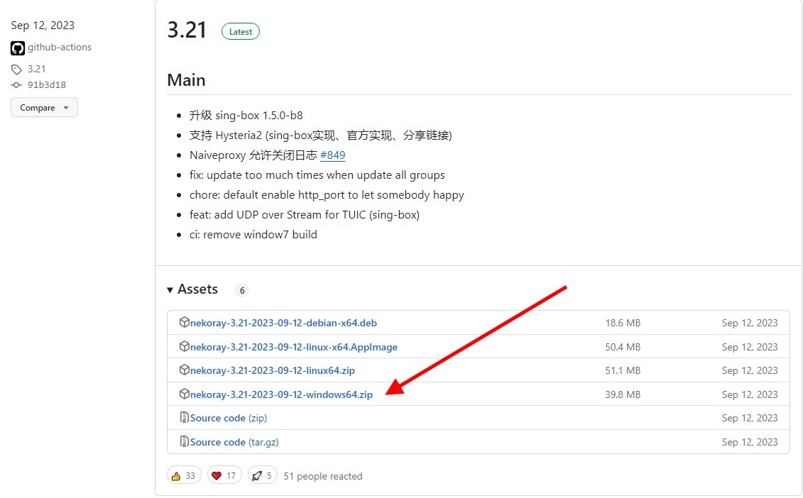 В списке найдите пометку зелёную «Latest» и скачайте файл, в имени которого есть «windows», например: nekoray-3.21-2023-09-12-windows64.zip.