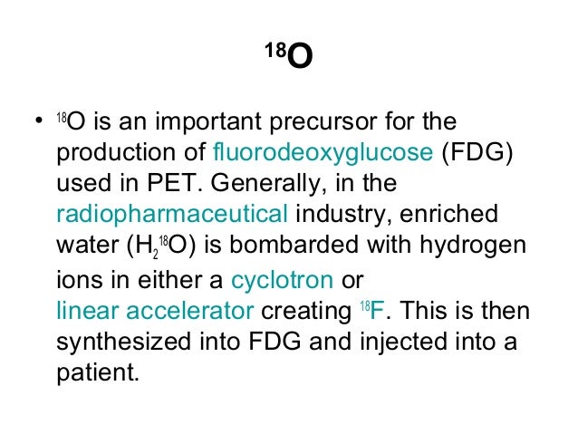 Oxygen-18 ( 18 O, Ω) is a natural, stable isotope of oxygen and one of the environmental isotopes . . 18 O is an important precursor for the production of fluorodeoxyglucose (FDG) used in positron emission tomography (PET) . Generally, in the radiopharmaceutical industry, enriched water (H 2 18 O) is bombarded with hydrogen ions in either a cyclotron or linear accelerator, creating fluorine- 18 .