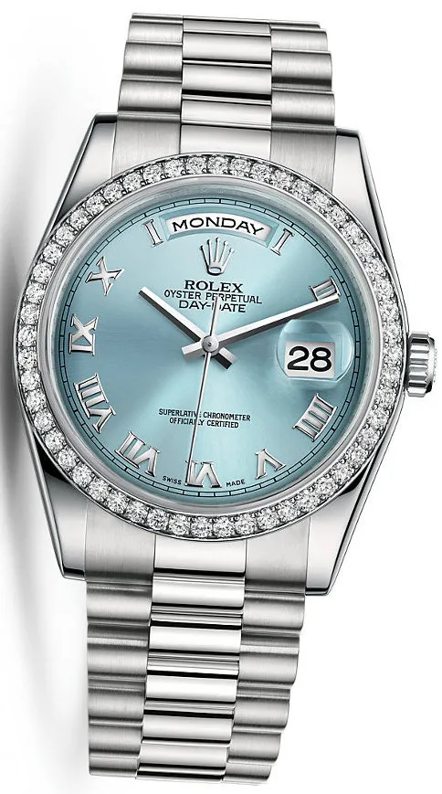 the Oyster Perpetual Day-Date was the first calendar wristwatch to indicate, in addition to the date , the day of the week spelt out in full in a window on the dial . Available only in precious metals, it embodies Rolex excellence and quickly became the watch for influential people . Its Oyster case, guaranteed waterproof to a depth of 100 metres (330 feet),