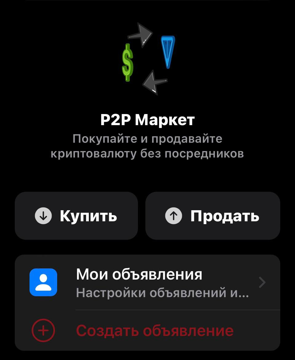 P2P площадка, это доска объявлений куда любой желающий авторизованный пользователь может разместить объявление купли-продажи криптовалюты. Так же P2P разделы есть на всех популярных биржах. Буду показывать на примере активно набирающего популярность Wallet прямо в телеграме(принцип работы p2p площадок не отличается и в других местах).