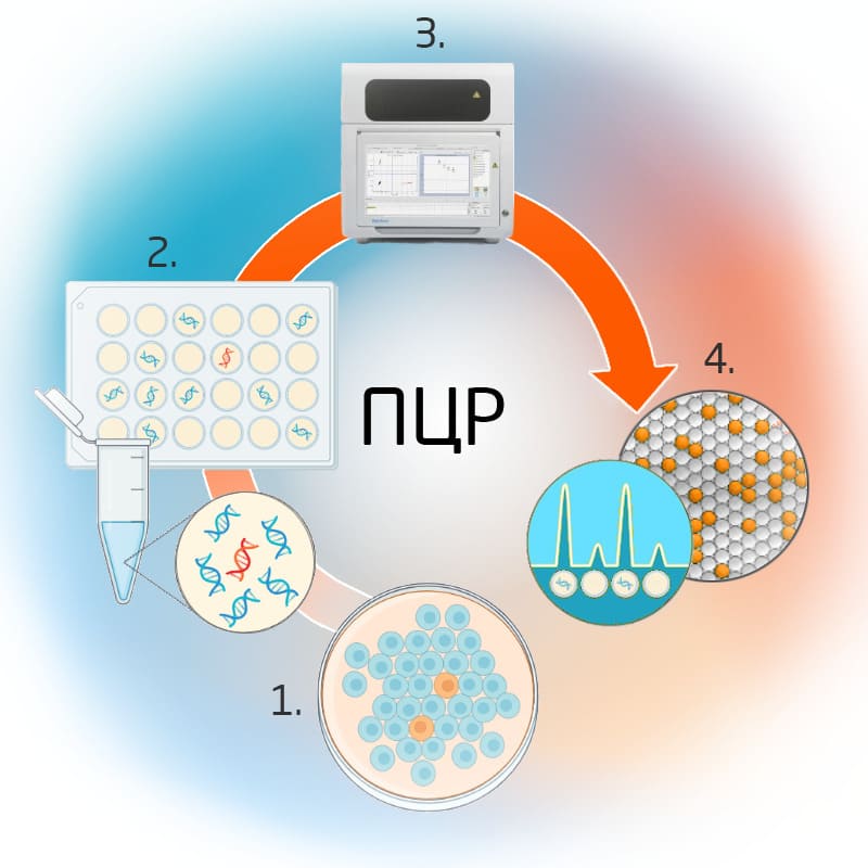 Благодаря своей исключительной чувствительности и специфичности в сочетании с возможностью проводить количественный анализ для разных типов биологических образцов цПЦР — это уникальный подход для исследования рака. Опухолевые клетки отличаются от здоровых множеством аномалий в генетическом материале и метаболизме, которые могут служить надежными маркерами для диагностики и оценки эффективности выбранной терапии. цПЦР — незаменимое решение для детектирования редких мутаций (Рис. 4) и продуктов обмена клеток раковой опухоли благодаря способности выявлять даже самые редкие молекулы в клиническом образце [7, 8].