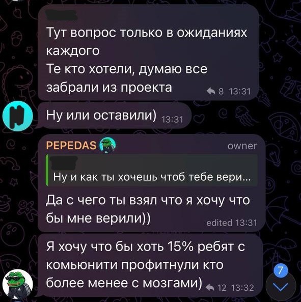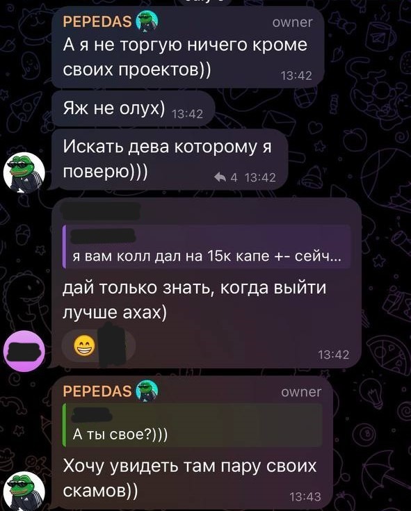 Активно коллил токен у себя на канале, разгонял чат на покупки в те моменты, когда странные кошельки проливали, совпадение?...