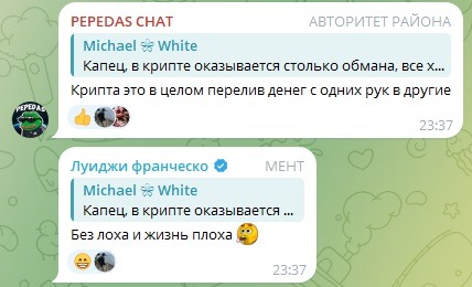 Успокаивает фад в чате пепедас он также, как и Виталик (наш первый подозреваемый), все будто по одной методичке, даже появлялись частенько в одно время. Есть ощущение, что сидят в своем приватном чате и координируют действия.