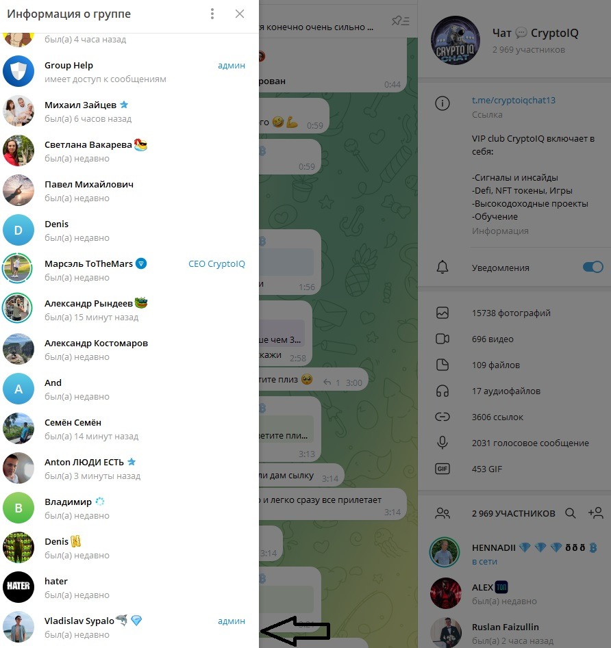 Читаете и думаете, наверное, ну невесомо, ну могут быть и совпадения такие, может просто от чистого сердца шиллит проект… А теперь вернемся к сообщению на скриншоте чуть выше «мне за тебя рассказывали кстати», и посмотрим на админ-состав чата канала, который принадлежит Марсэлю: