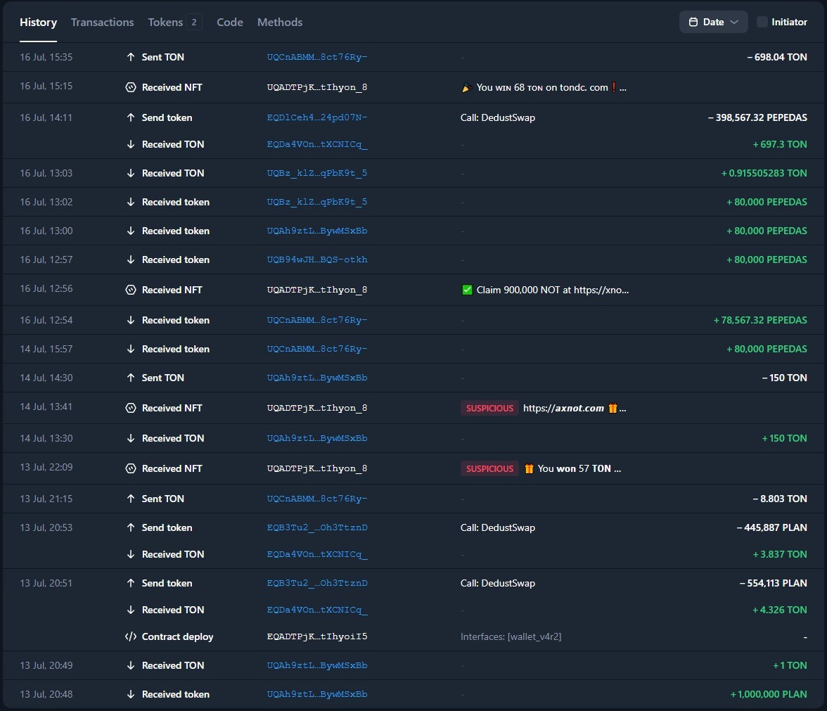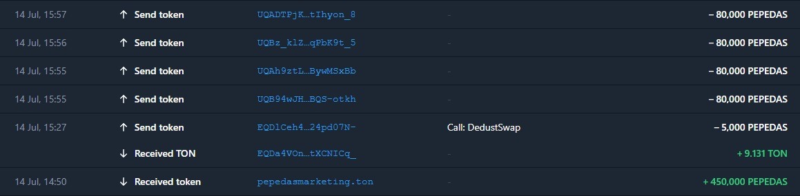 Первая транза 13 июля – получение монет PLAN от кошелька, имеющего отношение к пепедас.