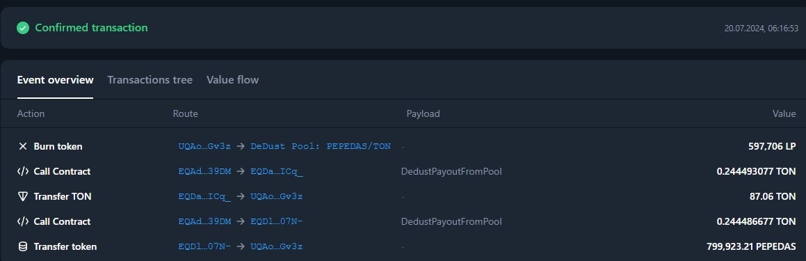 Получено 252.321 пепедас – транзакция - https://tonviewer.com/transaction/8a758b909bc2f3e70e897dc13e6d5e8904d6aa3e11502f6d2b4fb7abbba60a1a