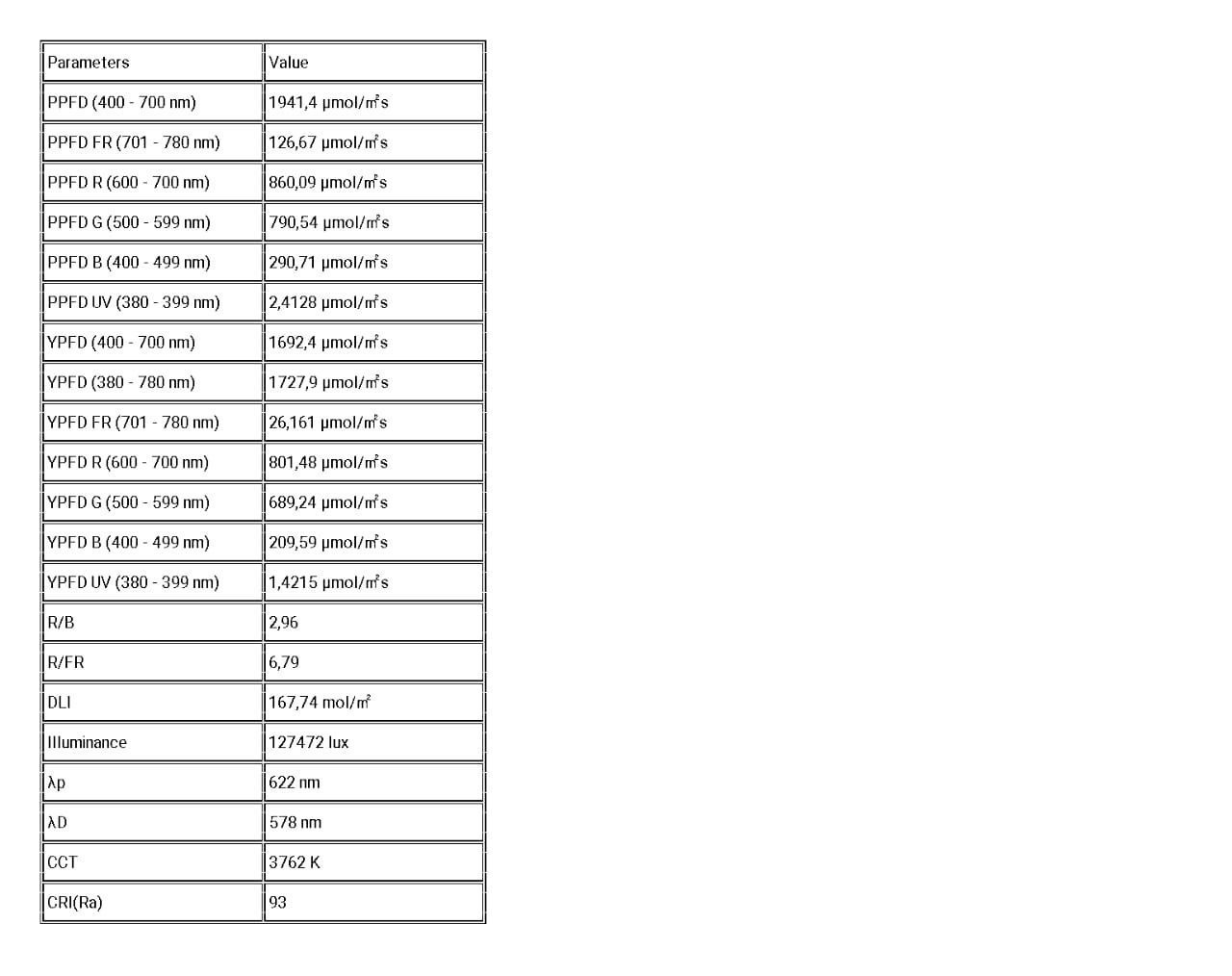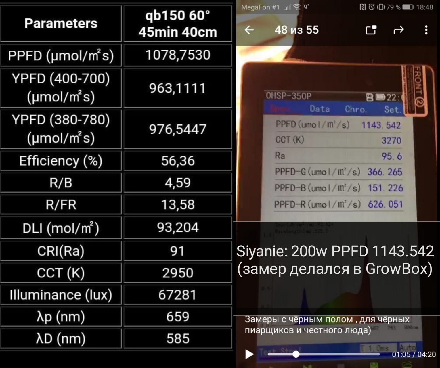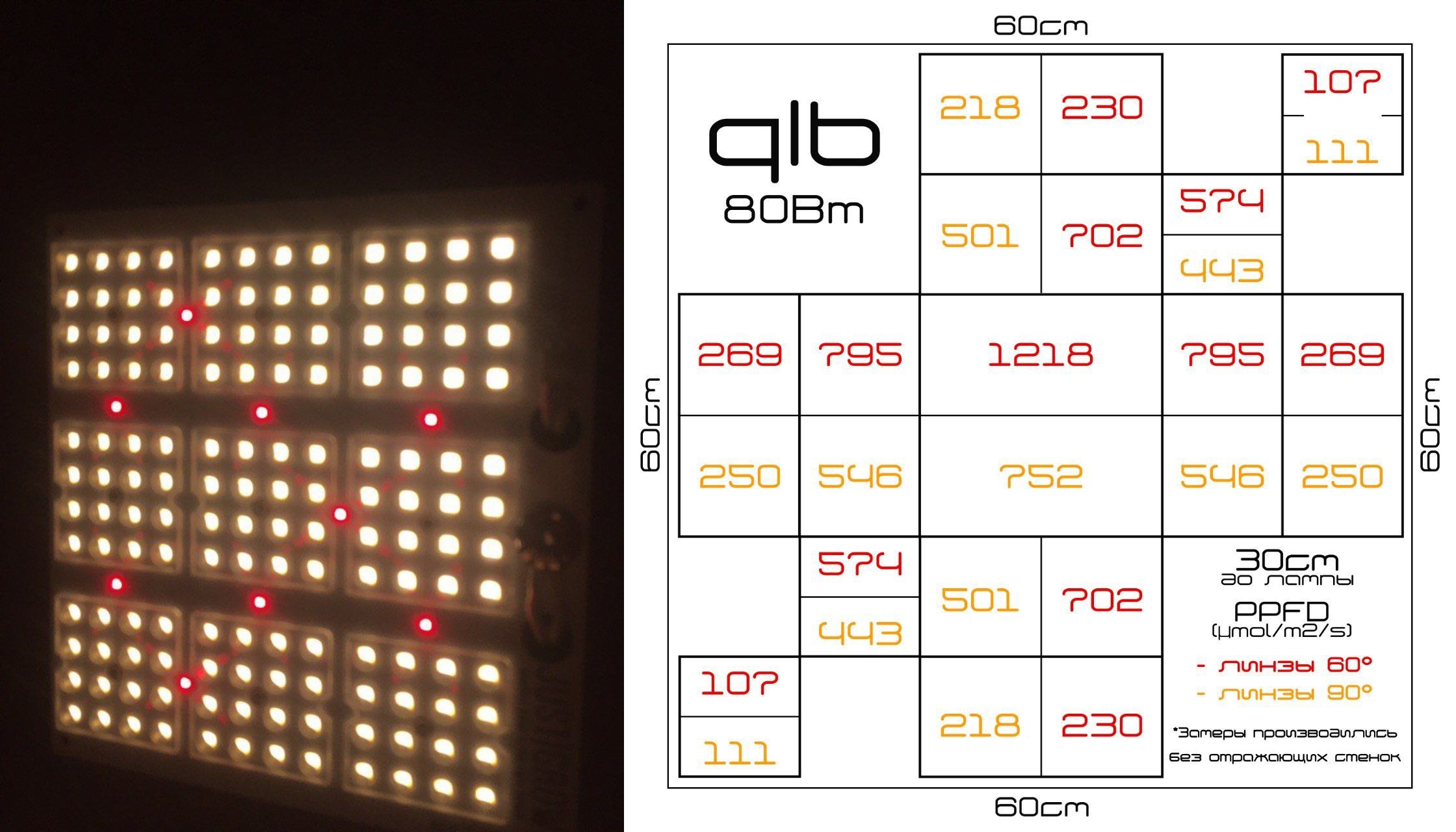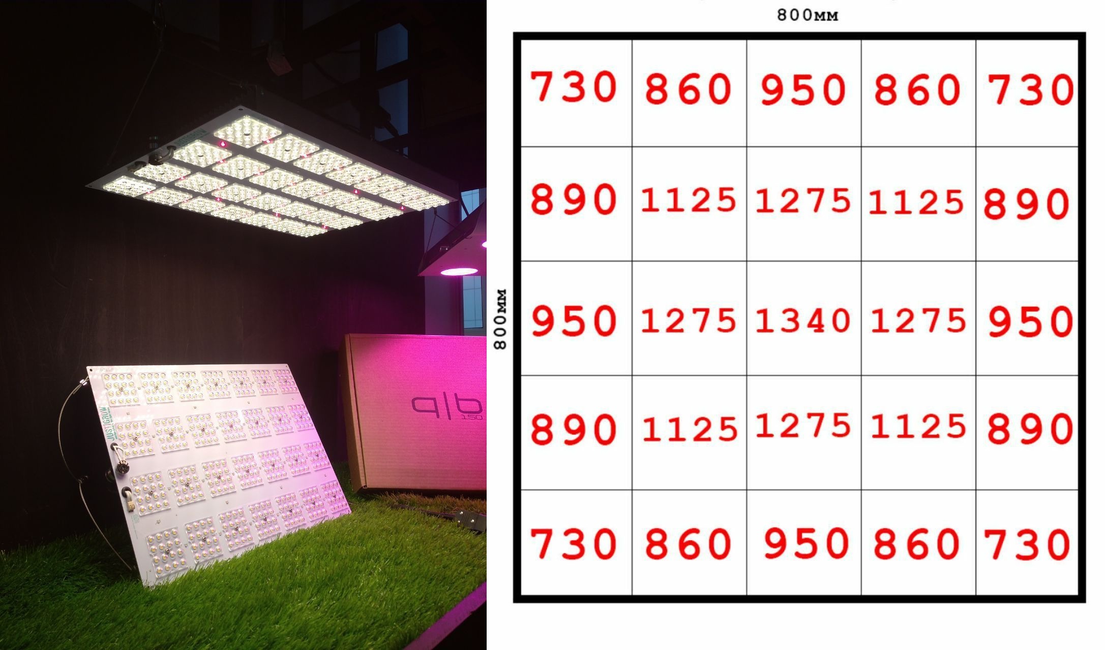 Для сравнения: справа замеры светильника на 200 w (PPFD 1143.542) в гроубоксе, слева замеры модели q|b 150w от Board💥Technologies (PPFD 1078.7530) без отражающих стенок.