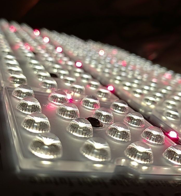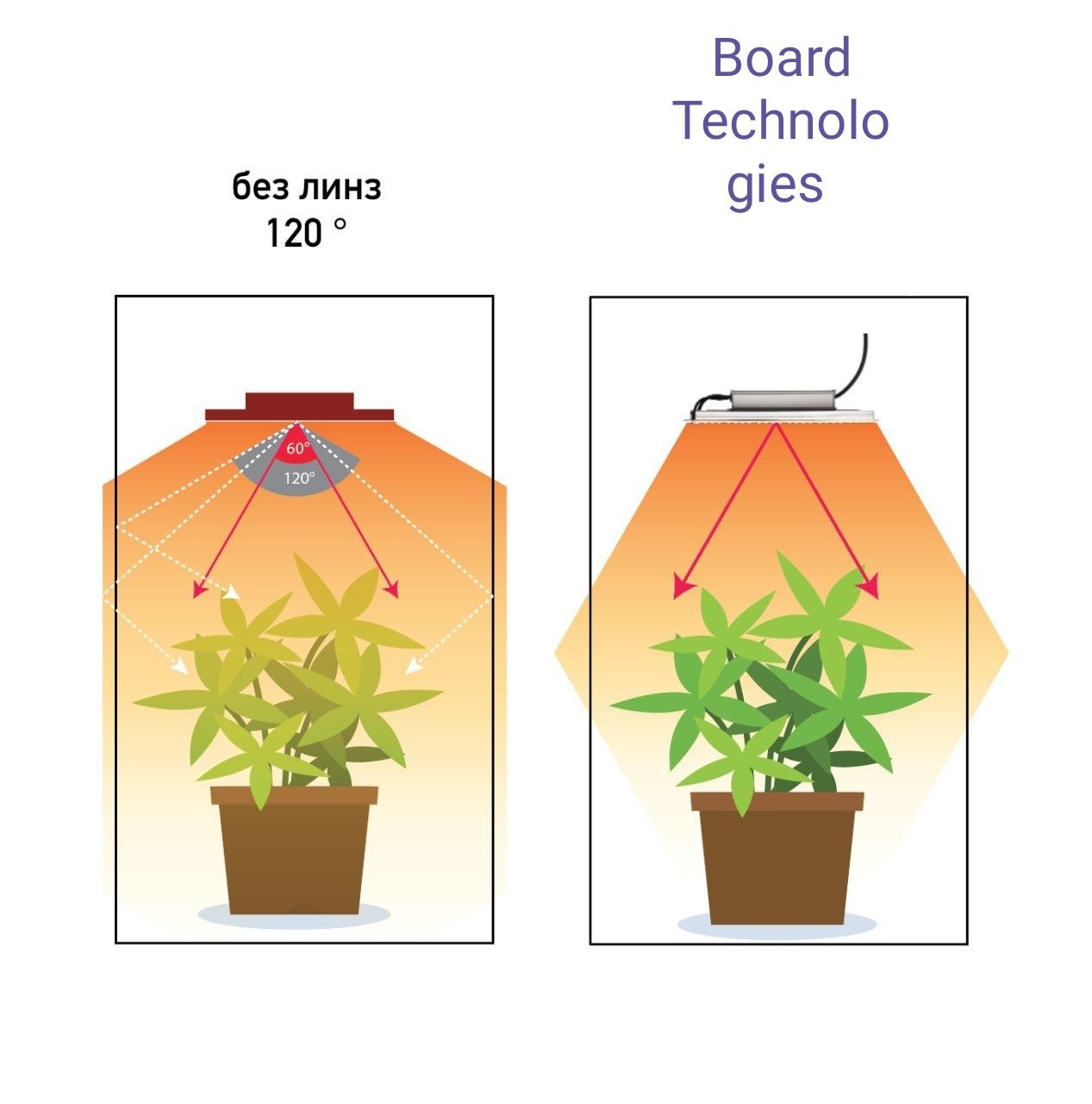 С помощью линз свет распространятся намного эффективнее: не улетает в стороны, а фокусируется на растение.