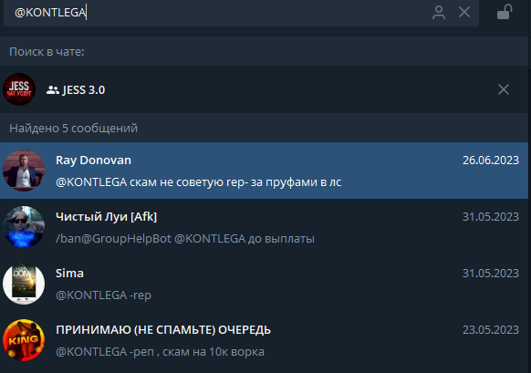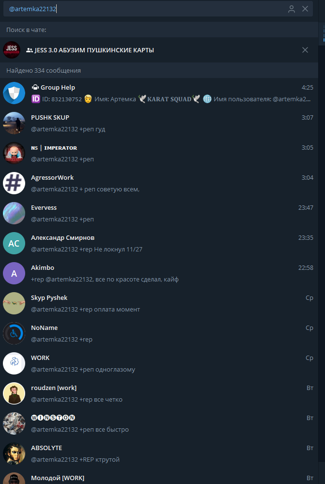 В чате очень много сообщений и они удаляются сами при достижении определённого кол-ва ( вроде как 500к/1кк ), поэтому советую всем, перекидывать отзывы о своей работе в выделенный канал с репутацией: https://t.me/JessRep
