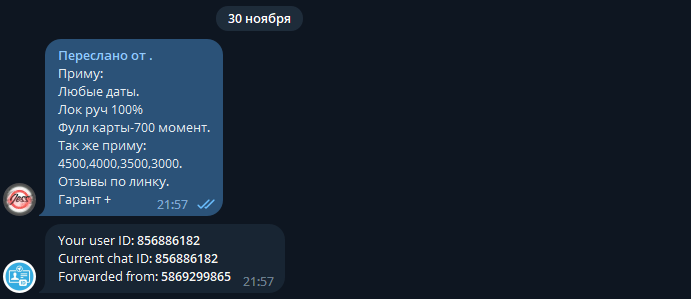 Второй способ это переслать сообщение пользователя в бота https://t.me/getmyid_bot и там будет написан ваш ID и 3 "Forwarded from(от кого отправлено сообщение)" ID скупа см. пример ниже👇