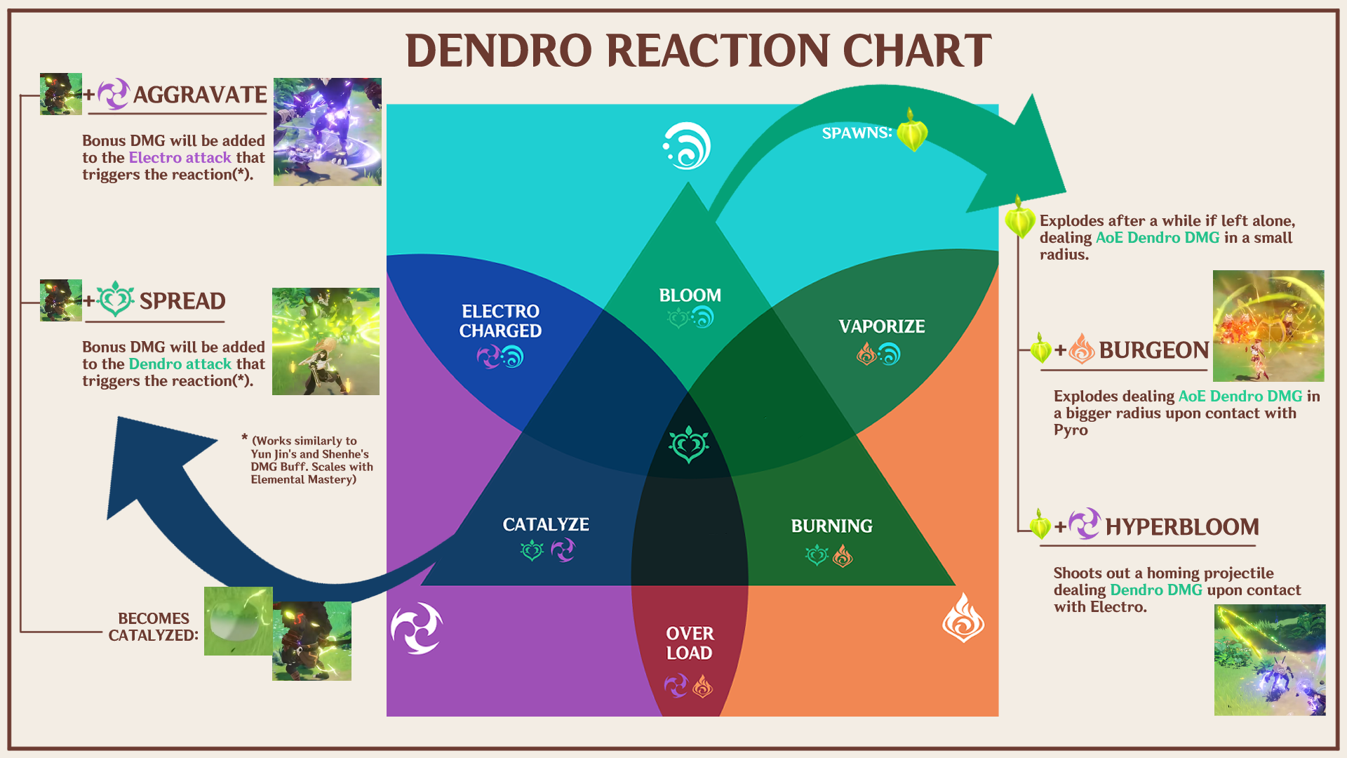 - Spread, Dendro applicato su Catalyze: viene aggiunto danno additivo al colpo che applica Dendro sul Catalyze. Il bonus segue l'ICD di applicazione del pg, non consuma l'aura del Catalyze ed ha moltiplicatore leggermente superiore all'Aggravate.