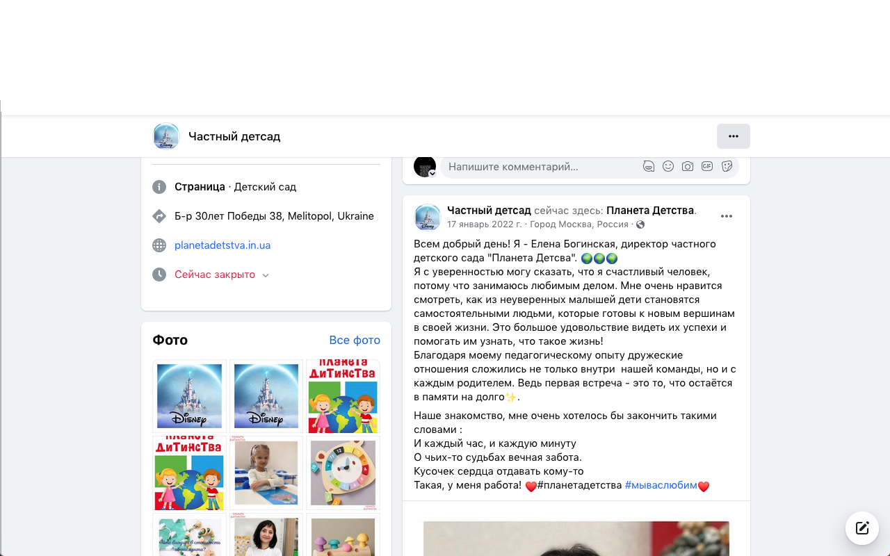3.№ Частный детский садик "Планета Детства" , посада - директор ( Мелітополь, бул. 30-річчя Перемоги, 38 | +380 (67) 183-99-29 | https://www.facebook.com/planetadetstva.in.ua/ |