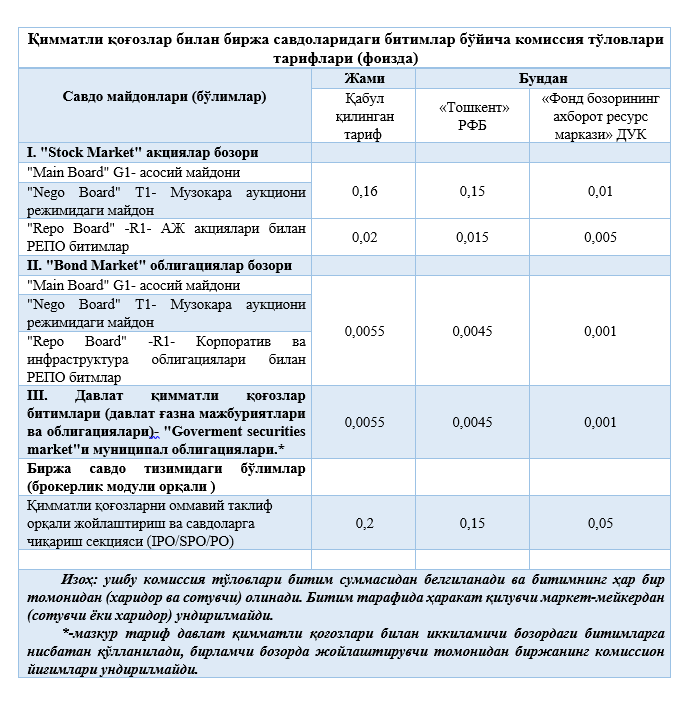 Таклиф қилинган янги тариф сиёсати асосида “Тошкент” РФБ томонидан қимматли қоғозлар билан биржа савдоларида ва кейинчалик биржа томонидан ташкиллаштирилиши кўзда тутилаётган биржадан ташқари уюшган савдолар (2022 йил 17 январдаги 90-сон ПҚга асосан) комиссия тўловлари бўйича янги тарифлар ишлаб чиқилган бўлиб, мазкур тарифлар “Тошкент” РФБ Кузатув Кенгашининг 2022 йил 19 июлдаги мажлисида тарифларни ўзгартириш ва такомиллаштириш киритиш тўғрисидаги масалалари кўриб чиқилди ва қуйидагича тасдиқланди: