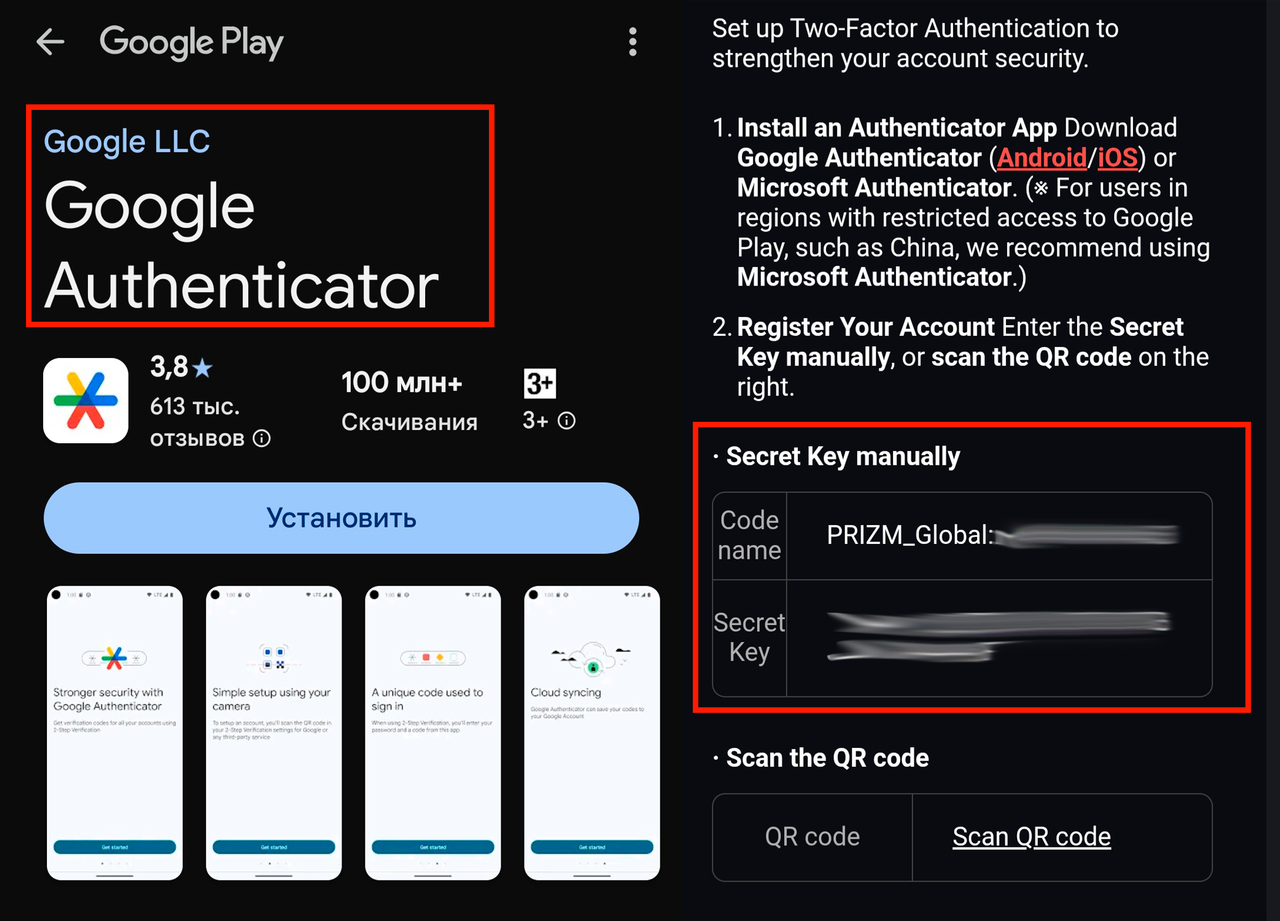3.1 Скачайте Google Authenticator. Нажмите на значок плюса в правом нижнем углу, затем "Ввести код настройки"