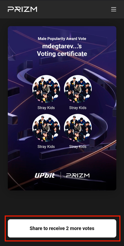 2. Вам высветится сертификат, нажмите "Share to receive 2 more votes". Выберите способ, которым хотите поделиться. Затем вы можете вернуться на главную страницу и отдать еще 2 голоса.