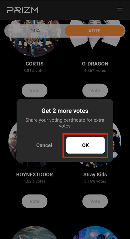 1. После того, как вы отдадите все голоса, вам предложат получить дополнительные голоса, поделившись вашим сертификатом голосования. Нажмите на "OK"