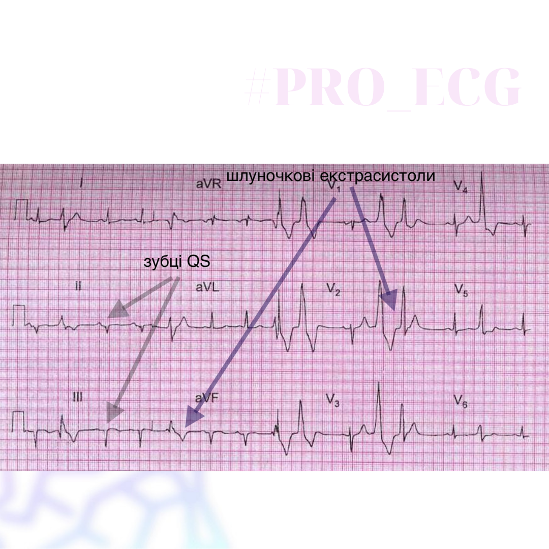 На даній ЕКГ-плівці спостерігається синусовий нерегулярний ритм з частими політопними шлуночковими екстрасистолами. ЕВС нормальна. У відведеннях II ІІІ та aVF спостерігаються патологічні зубці QS. Зубець Т сплощений у відведеннях II III та V5-6.