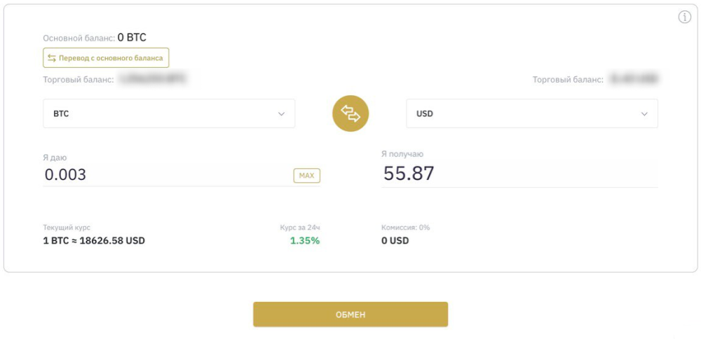 Для того, чтобы произвести обмен, нужно зарегистрироваться на бирже и войти в свою учетную запись. Следующий важный шаг — перевод необходимой суммы с Основного баланса на Торговый. Это можно сделать не покидая страницу.