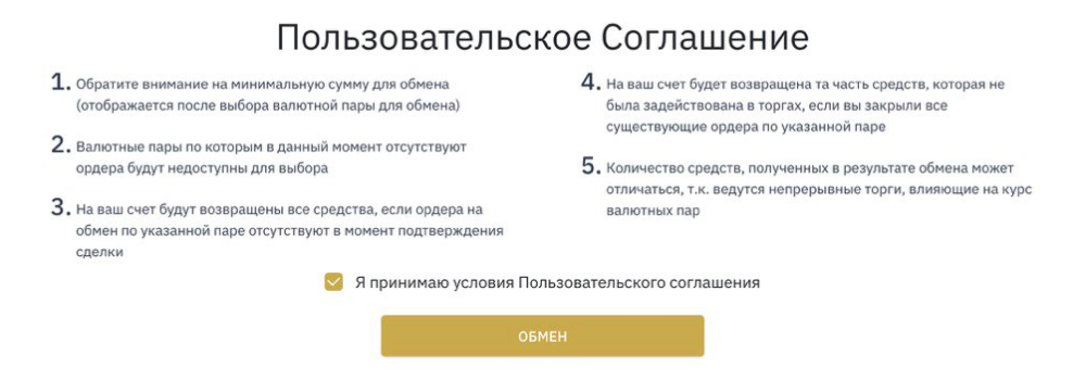 При первом использовании страницы “Обмен” необходимо согласиться с Пользовательским соглашением (это нужно сделать только один раз). Для этого Вам нужно отметить галочкой строку “Я согласен с Пользовательским соглашением” перед тем, как нажать кнопку “Обмен”.